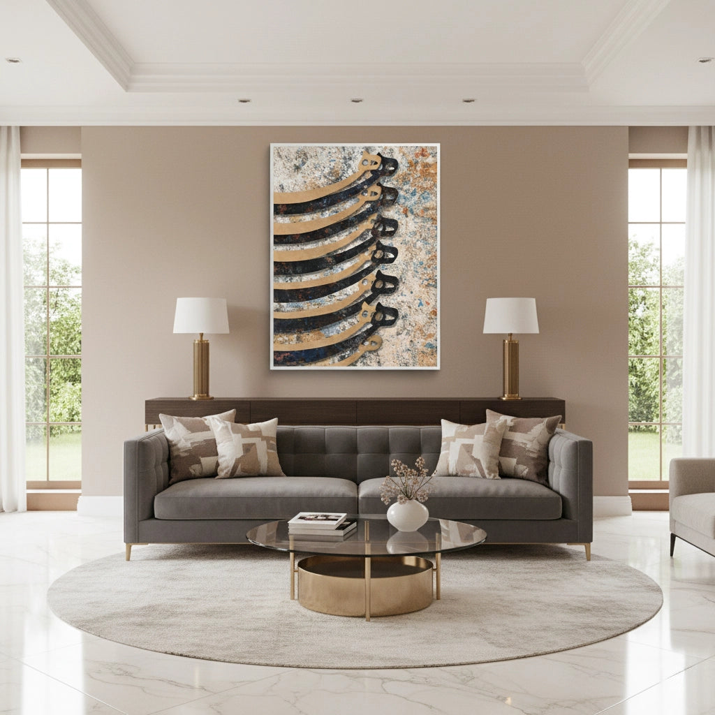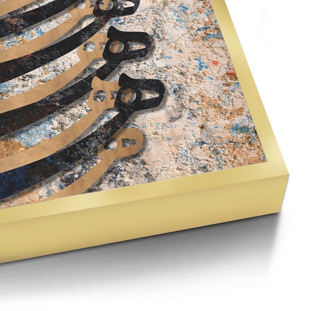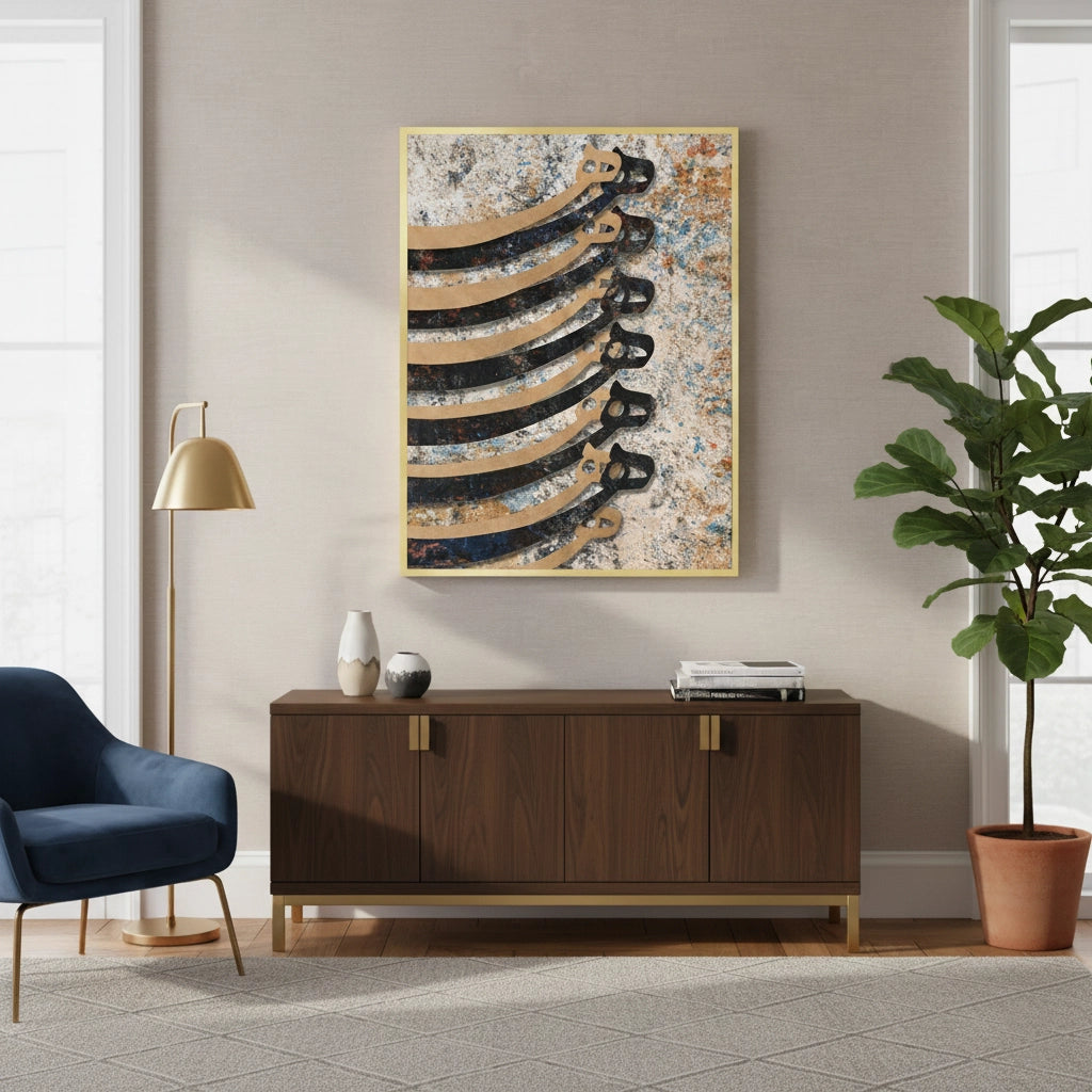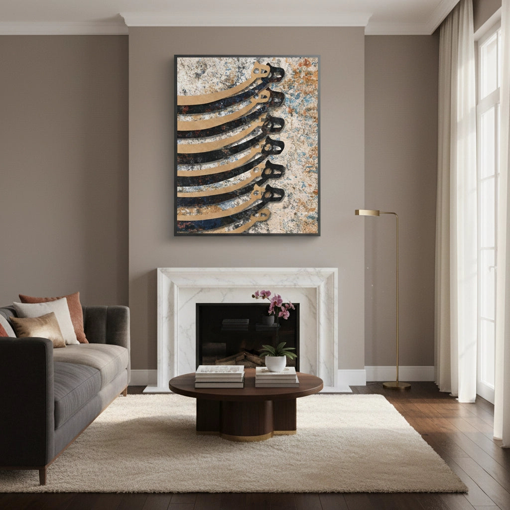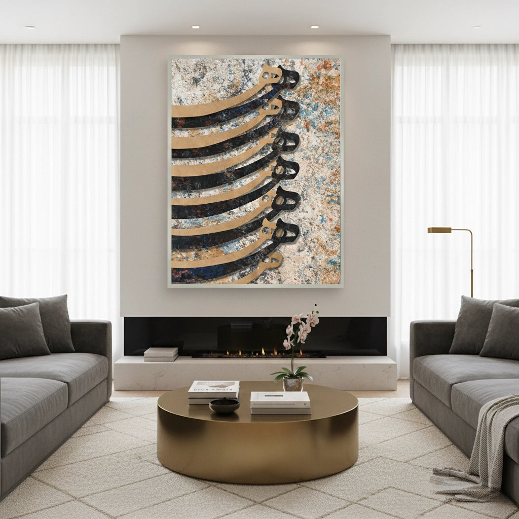 The impactful Patina & Calligraphy - Rustic Gold print is a striking fusion of industrial texture and spiritual luxury. The upper canvas features an aged, distressed patina effect with faded script, evoking history and weathering. This contrasts dramatically with the lower section's deep, rich brown-black texture, which serves as a powerful backdrop for a crisp, luminous metallic gold calligraphy design. This piece masterfully blends the raw beauty of decay with the timeless elegance of gold script. Ideal for adding a bold, artistic, and sophisticated textural statement to a modern loft or luxury space in Dubai.