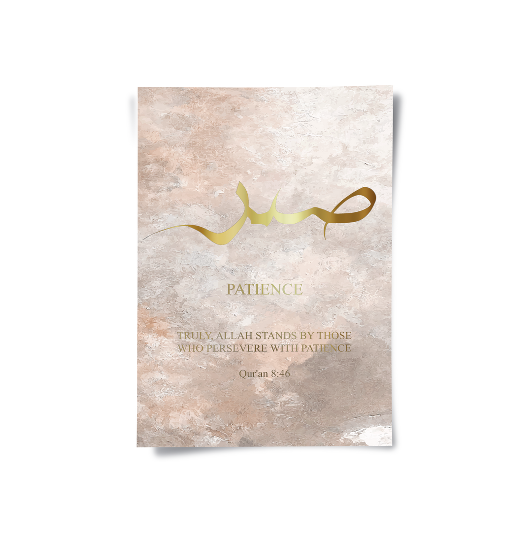 Cultivate a home of serenity with the Peace, Patience & Love triptych set from Jasmine Art. This sophisticated Set of 3 features the core Islamic values of Salam, Sabr, and Hubb in radiant metallic gold Arabic calligraphy, each paired with its meaningful Quranic verse and English translation. The muted rose-gold and stone-textured background offers a contemporary yet spiritual aesthetic. Finished with our signature premium vertical texture, each print provides a high-end tactile experience. A profound and stylish spiritual statement for a master bedroom, a family lounge, or a serene majlis in Dubai.