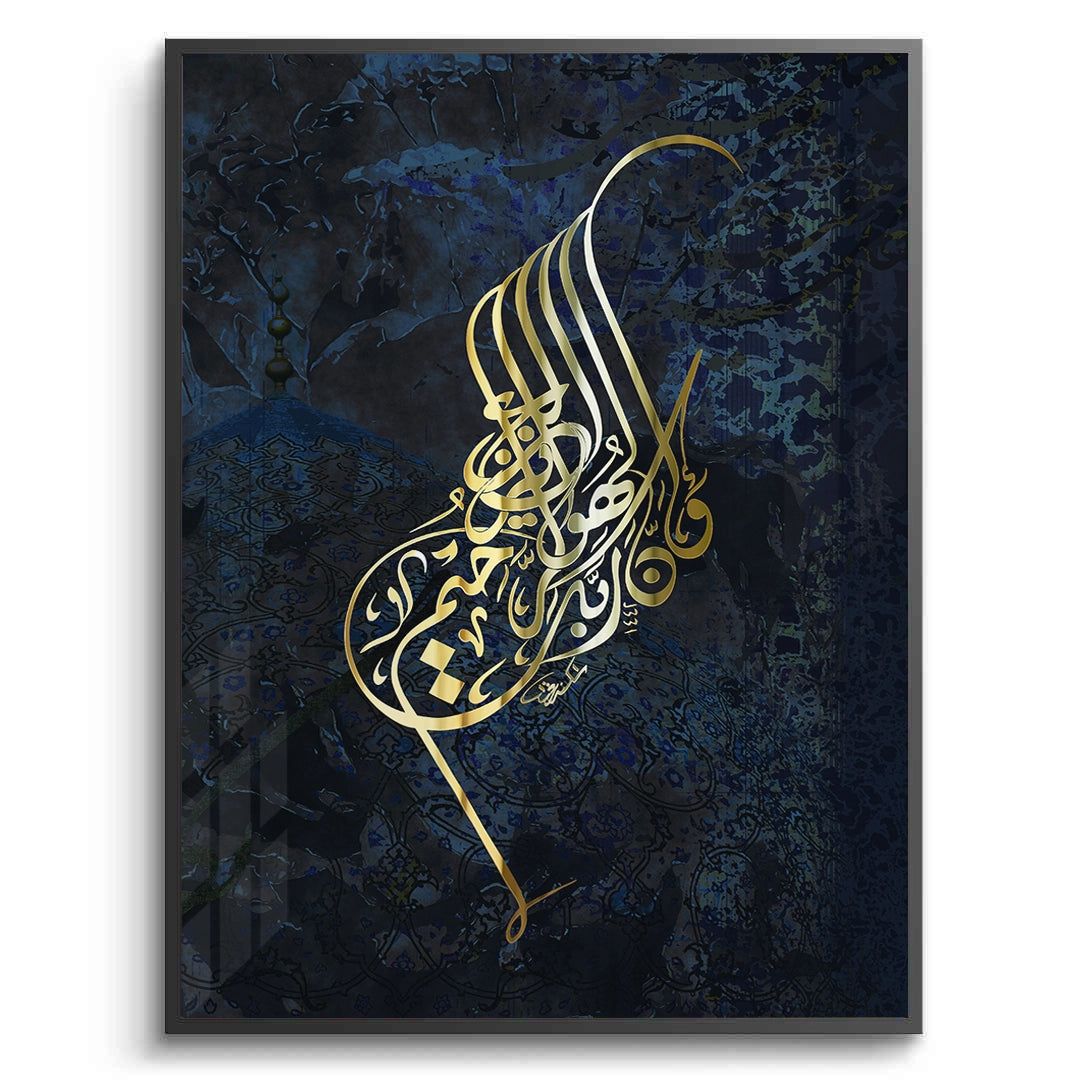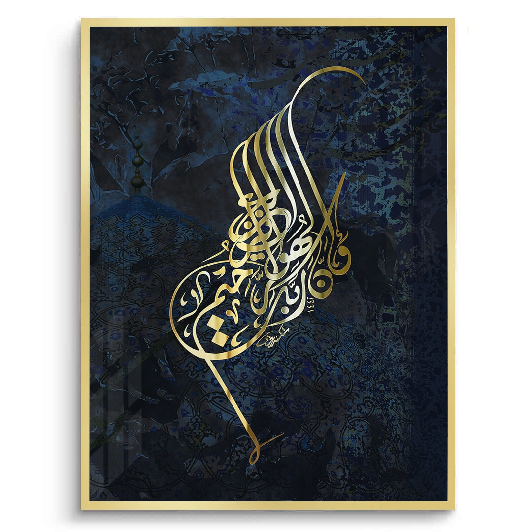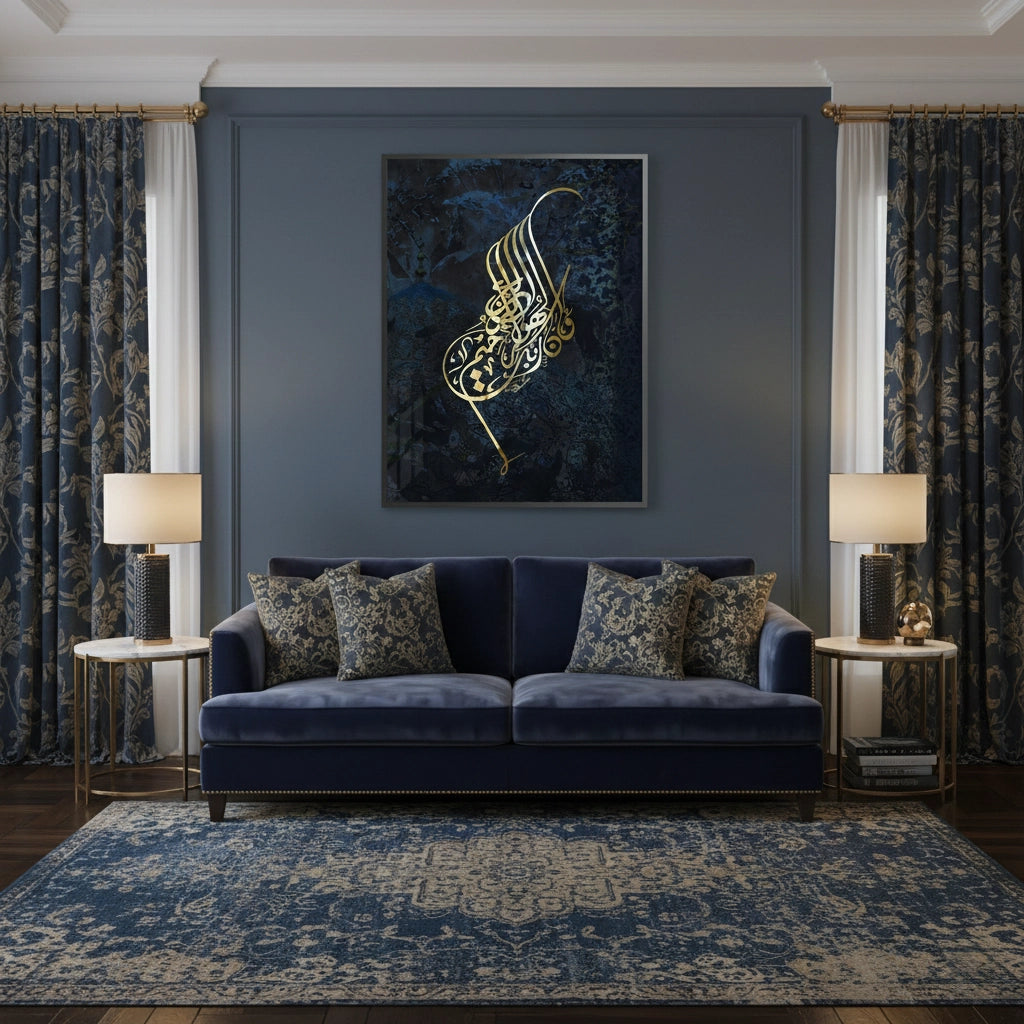 Illuminate your home with the celestial beauty of Divine Radiance from Jasmine Art’s Arabic Calligraphy collection. This breathtaking piece features intricate golden calligraphy flowing like a divine flame against a deep midnight-blue textured backdrop. The subtle hints of mosaic patterns and mosque silhouettes in the background add a layer of spiritual history and depth. Finished with our signature premium texture, this print interacts beautifully with light to create a stunning metallic glow. An ideal centerpiece for a grand Majlis, a luxury living room, or a serene prayer space in Dubai.
