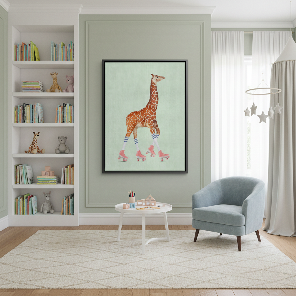 The hilarious and fashionable Pink Roller Skate Giraffe print is a wonderfully quirky piece guaranteed to be a conversation starter. This imaginative digital artwork features a realistic giraffe showing off its moves in bright pink roller skates and athletic striped socks. Set against a cool, pastel mint green background, this print offers a blend of sophisticated illustration and playful, unexpected humour. It is perfect for adding a fun, stylish, and memorable animal touch to a nursery or child’s room in Dubai.