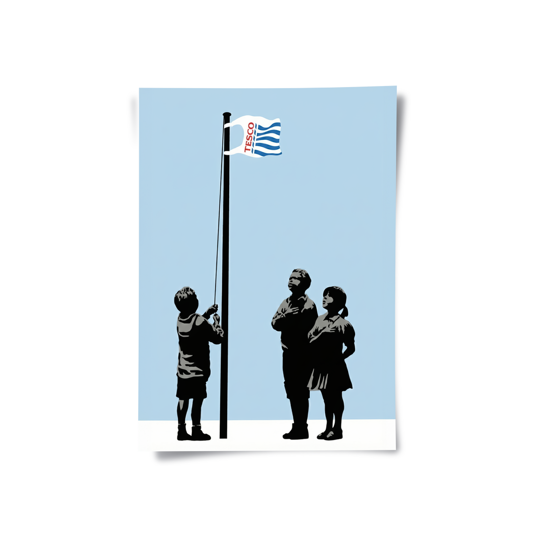 Make a bold statement about modern consumerism with the Pledge Allegiance print from Jasmine Art’s Banksy series. This provocative stencil-style artwork depicts children saluting a plastic carrier bag, offering a sharp critique of brand loyalty and corporate influence. Its clean minimalist composition and striking symbolism create a powerful focal point for any contemporary interior. Finished with our signature premium vertical texture, this print offers exceptional tactile depth and a high-end gallery finish. A thought-provoking addition for a modern study, a creative office, or a trendy lounge in Dubai.