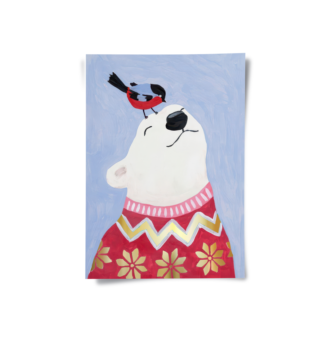 The absolutely adorable Polar Bear print is the perfect way to celebrate the festive season in a child’s room or nursery. This whimsical artwork features a charming polar bear wearing a cozy red and white Christmas sweater. The sweater is decorated with cheerful patterns highlighted in shimmering metallic gold foil. With a friendly little bird perched on its head, this print adds a sweet, festive, and luxurious touch of winter magic to your home in Dubai.