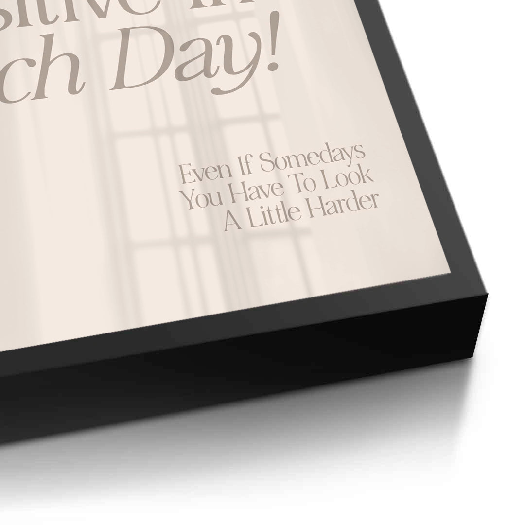 The serene Positive Day - Minimalist Motivational Typography print offers a gentle yet important daily affirmation. The central quote, "Look For Something Positive In Each Day!", is elegantly presented in a subtle grey/taupe Serif font, maintaining a sophisticated, muted color palette. A secondary line adds a thoughtful, inspiring touch. Set against a soft, textured off-white canvas, this minimalist design fits seamlessly into virtually any modern luxury interior. Ideal for adding a calming, positive, and chic accent to a bedroom, study, or sophisticated living area in Dubai.