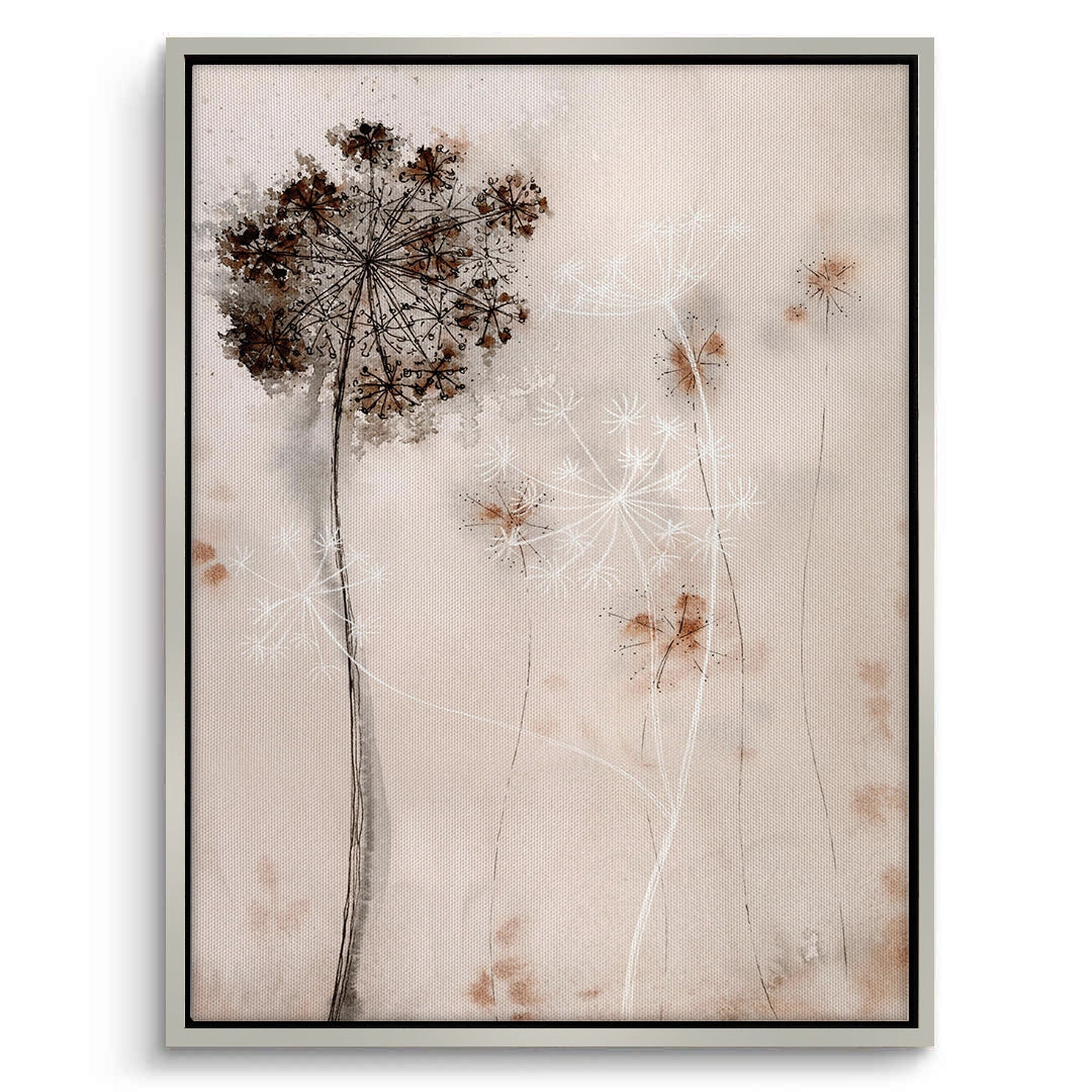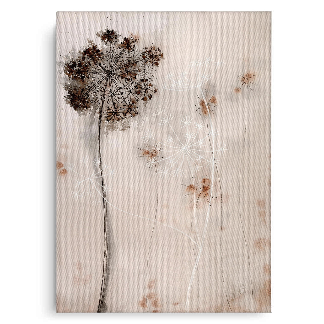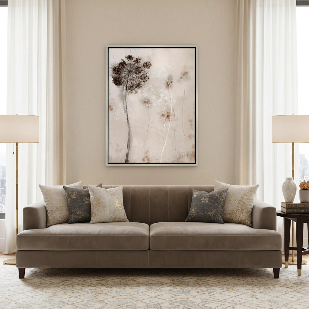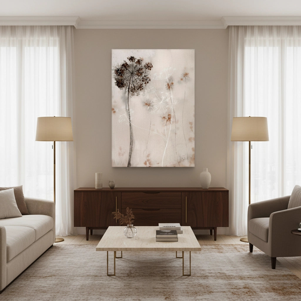 The delicate Queen Anne's Lace print is a serene piece of abstract watercolor botanical art. This canvas features the intricate, lace-like pattern of the Queen Anne's Lace flower, rendered in contrasting styles: a deep, moody sepia wash and a soft, airy white silhouette. Set against a soft blush/beige background, this artwork perfectly blends natural simplicity with a touch of rustic, romantic elegance. It is an excellent choice for adding a calm, earthy, and sophisticated touch to a sunlit room or gallery wall in Dubai.