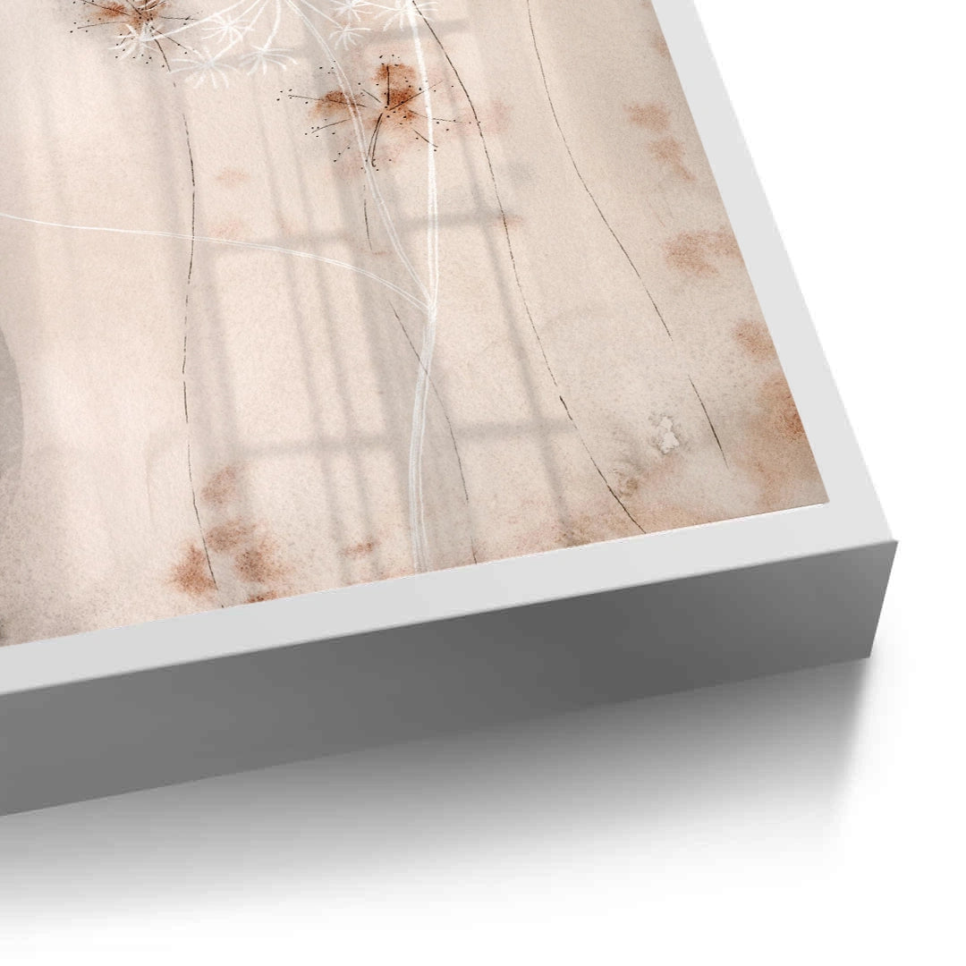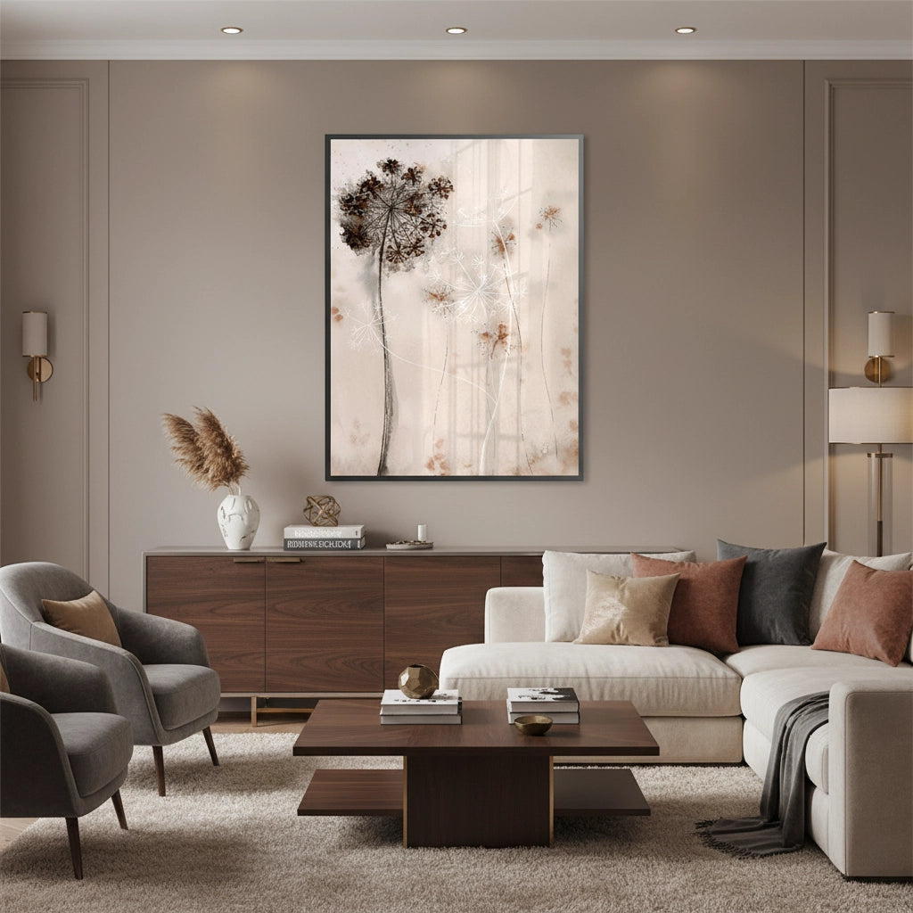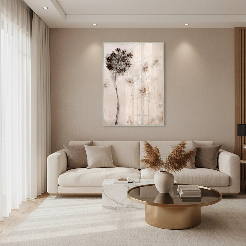 The delicate Queen Anne's Lace print is a serene piece of abstract watercolor botanical art. This canvas features the intricate, lace-like pattern of the Queen Anne's Lace flower, rendered in contrasting styles: a deep, moody sepia wash and a soft, airy white silhouette. Set against a soft blush/beige background, this artwork perfectly blends natural simplicity with a touch of rustic, romantic elegance. It is an excellent choice for adding a calm, earthy, and sophisticated touch to a sunlit room or gallery wall in Dubai.