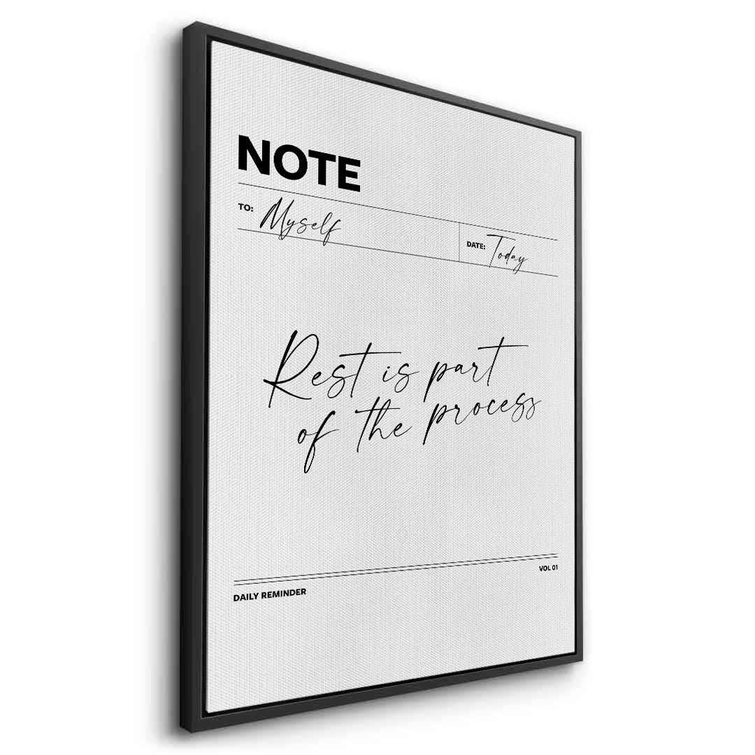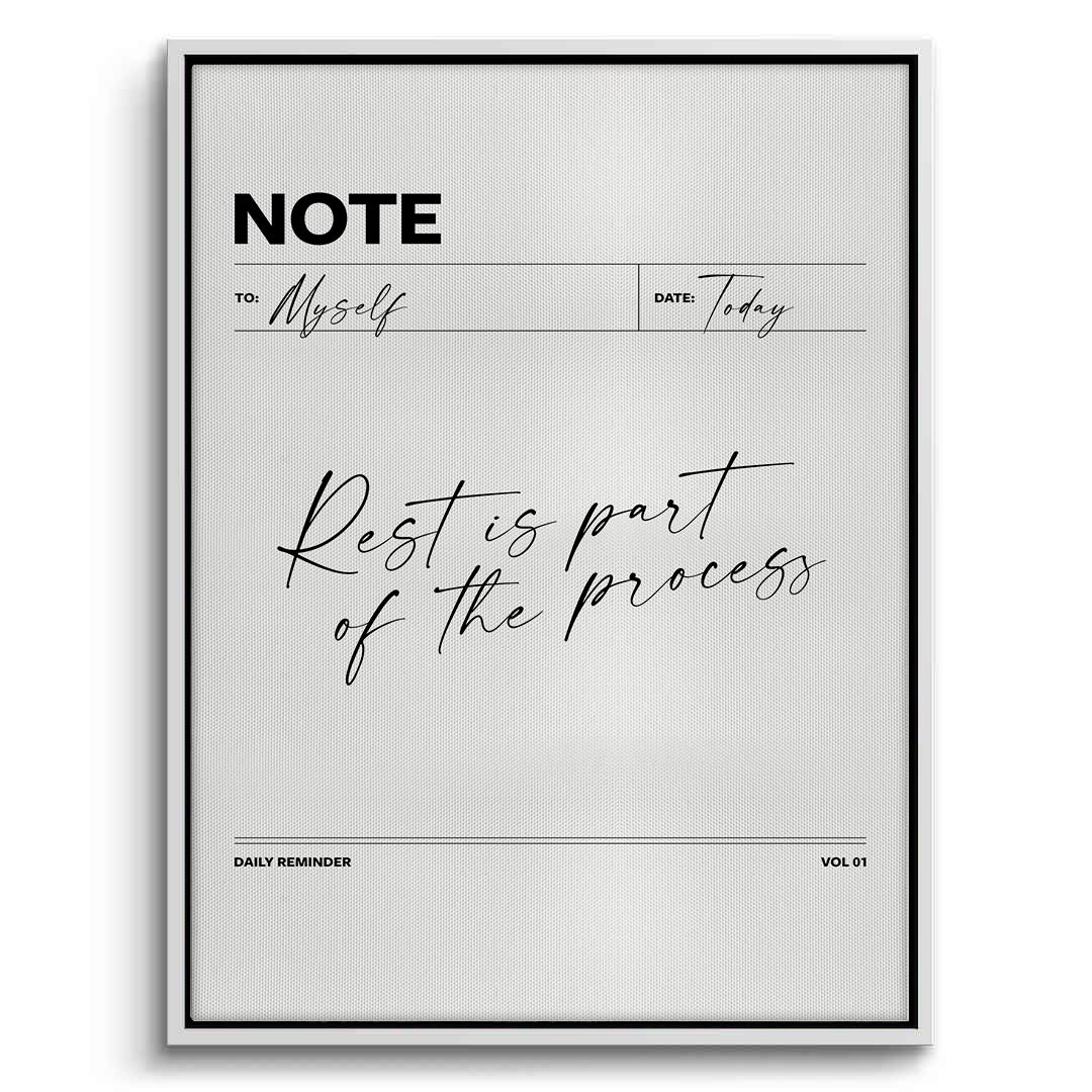 The elegant Rest is Part of the Process - Wellness Note Typography print is a sophisticated daily reminder for prioritizing self-care. Designed like a stylish minimalist 'NOTE' page, the piece features the tranquil quote "Rest is part of the process" in flowing, refined black script typography. Accompanying elements like "TO: Myself" and "DAILY REMINDER" in clean sans-serif text reinforce the personal wellness theme. Set against a soft, textured off-white canvas, this minimalist artwork adds a calming, chic, and thoughtful touch to a modern bedroom, home office, or quiet reading nook in Dubai.