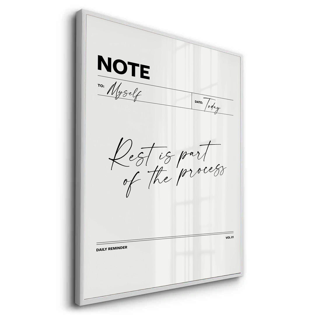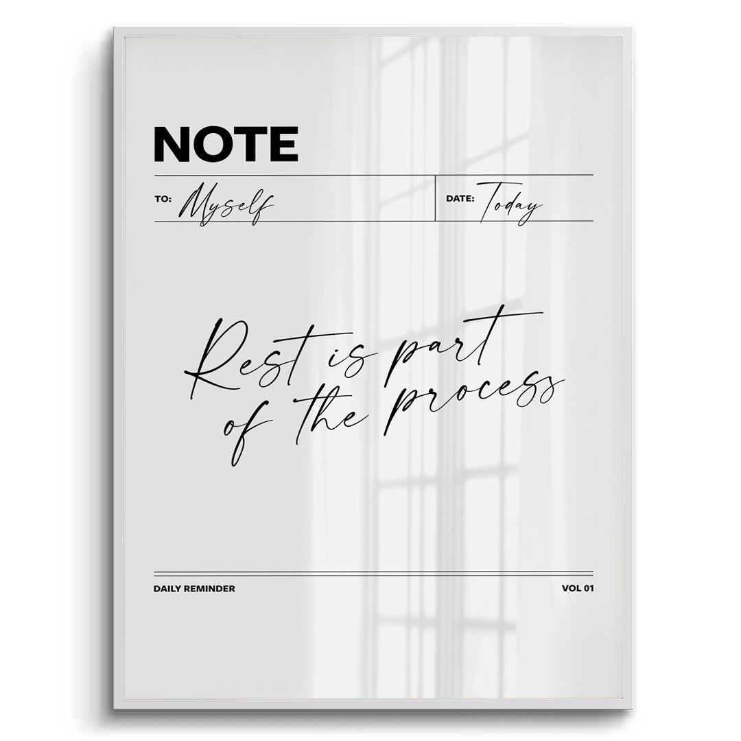 The elegant Rest is Part of the Process - Wellness Note Typography print is a sophisticated daily reminder for prioritizing self-care. Designed like a stylish minimalist 'NOTE' page, the piece features the tranquil quote "Rest is part of the process" in flowing, refined black script typography. Accompanying elements like "TO: Myself" and "DAILY REMINDER" in clean sans-serif text reinforce the personal wellness theme. Set against a soft, textured off-white canvas, this minimalist artwork adds a calming, chic, and thoughtful touch to a modern bedroom, home office, or quiet reading nook in Dubai.