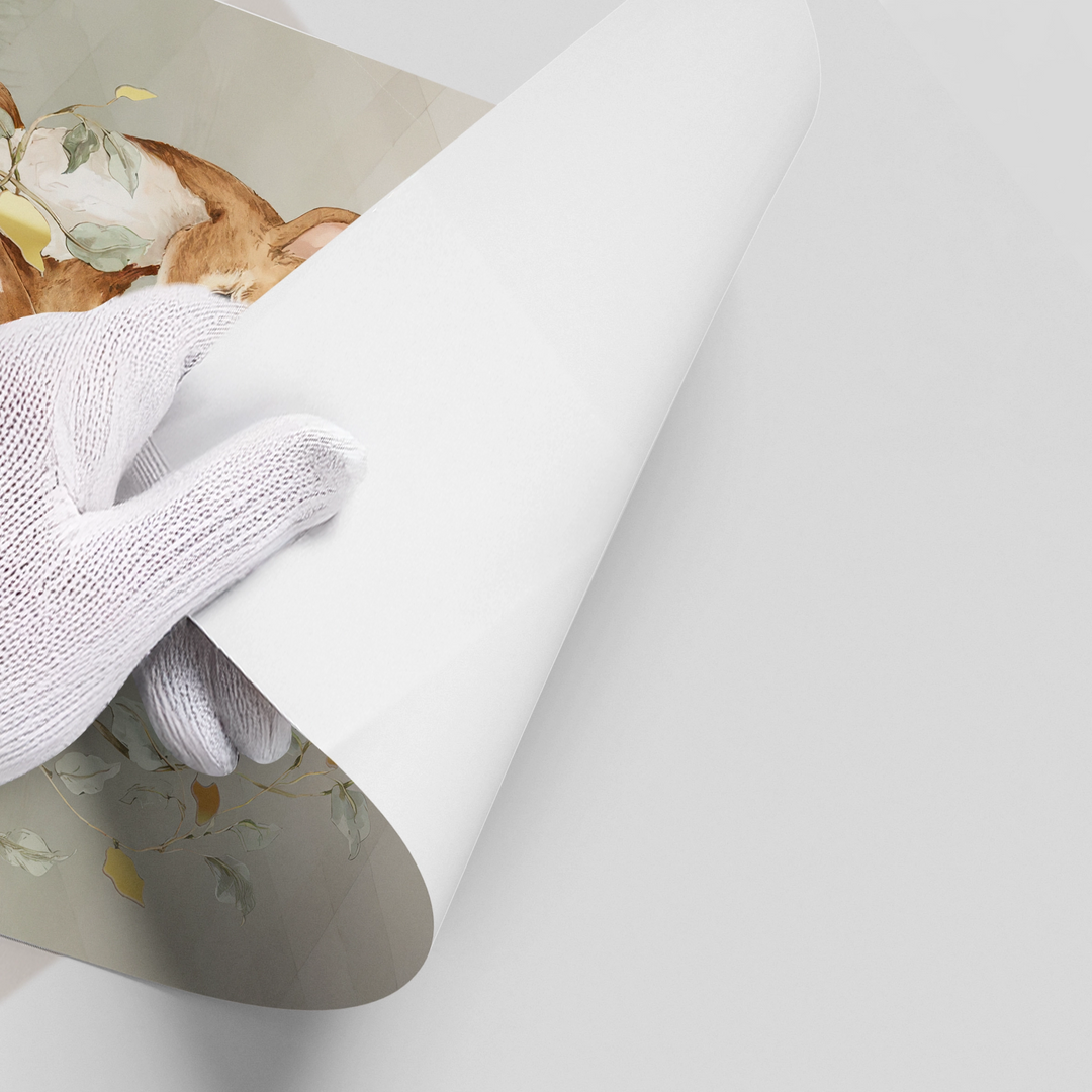 This peaceful print features a serene resting deer framed by elegant metallic gold leaves. The combination of gentle nature and a touch of metallic luxury makes the Resting Deer & Gold Leaves print a sophisticated addition to a Bohemian or modern nursery.