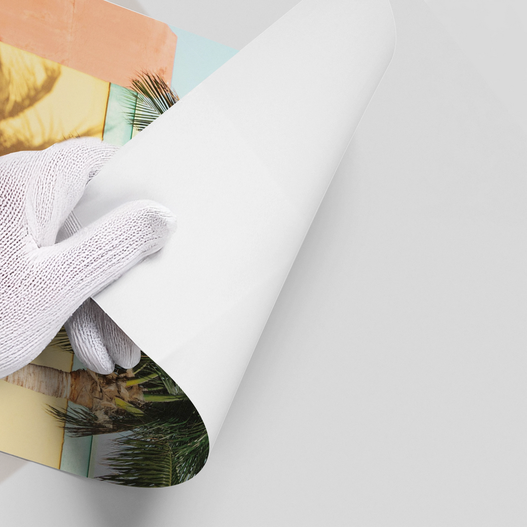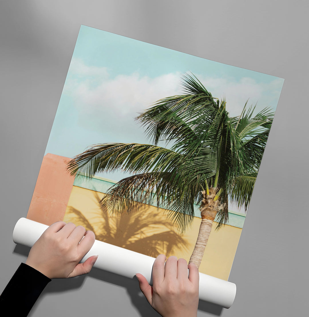 The vibrant Retro Palm Tree print captures the nostalgic energy of a vintage tropical getaway. This canvas features a detailed palm tree casting a large shadow across brightly colored walls in sunny yellow and soft peach. The pop of color and high contrast composition gives this piece a distinct Mid-Century Modern and retro aesthetic. It is a cheerful, statement piece perfect for adding tropical boldness and sunshine to a modern living area or vacation-themed room in Dubai.