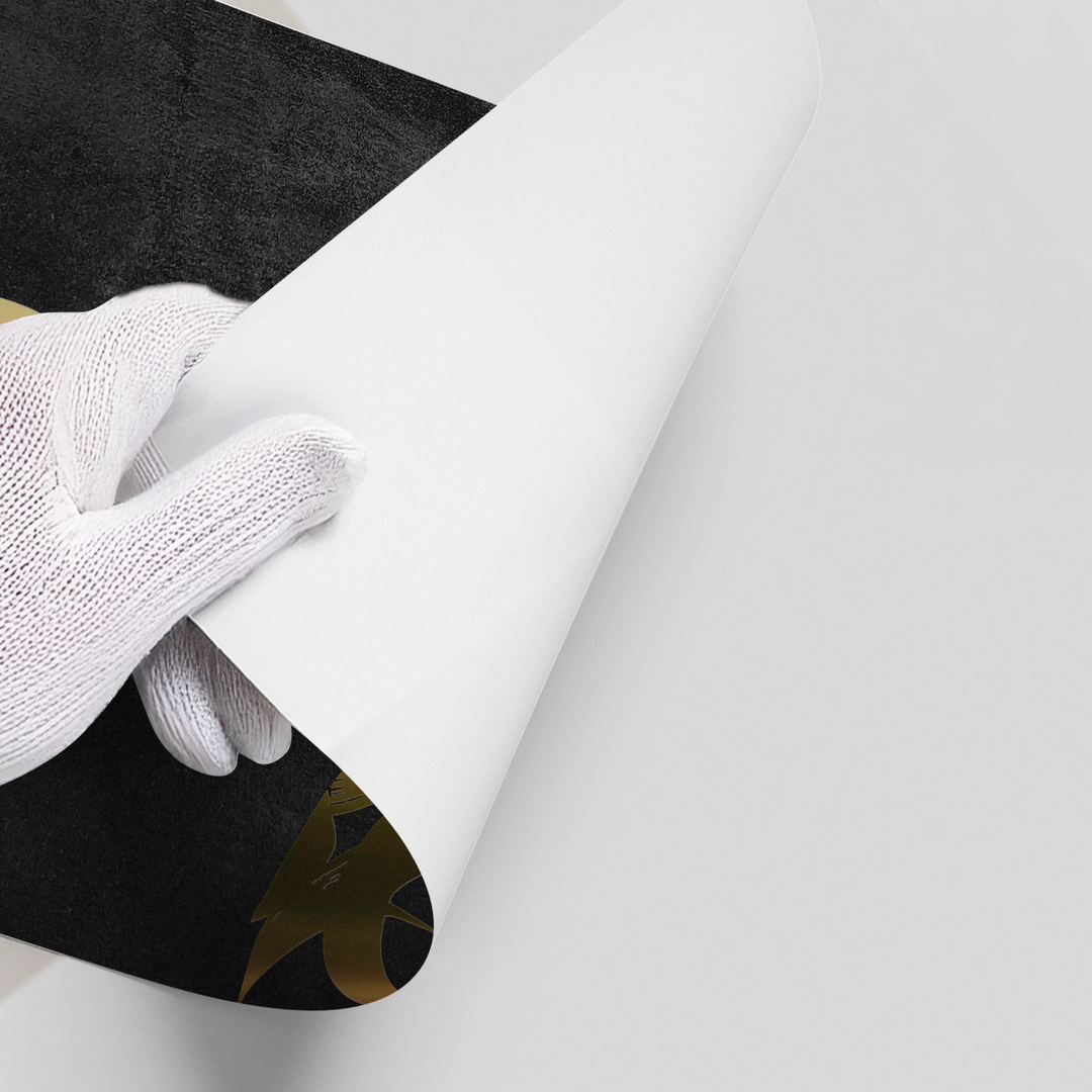The mesmerizing Rhythmic Flow - Gold on Black Velvet print is the epitome of luxurious, contemporary Islamic art. This dramatic piece showcases sweeping, expressive Arabic calligraphy rendered in dazzling metallic gold foil. The fluid strokes diagonally slice the canvas, leaving an elegant tail that curves down towards the center. The gold script is set against a deep, textural black velvet background, creating a high-contrast and profoundly elegant statement. Ideal for adding a chic, dynamic, and opulent focal point to a modern living space or high-end office in Dubai.