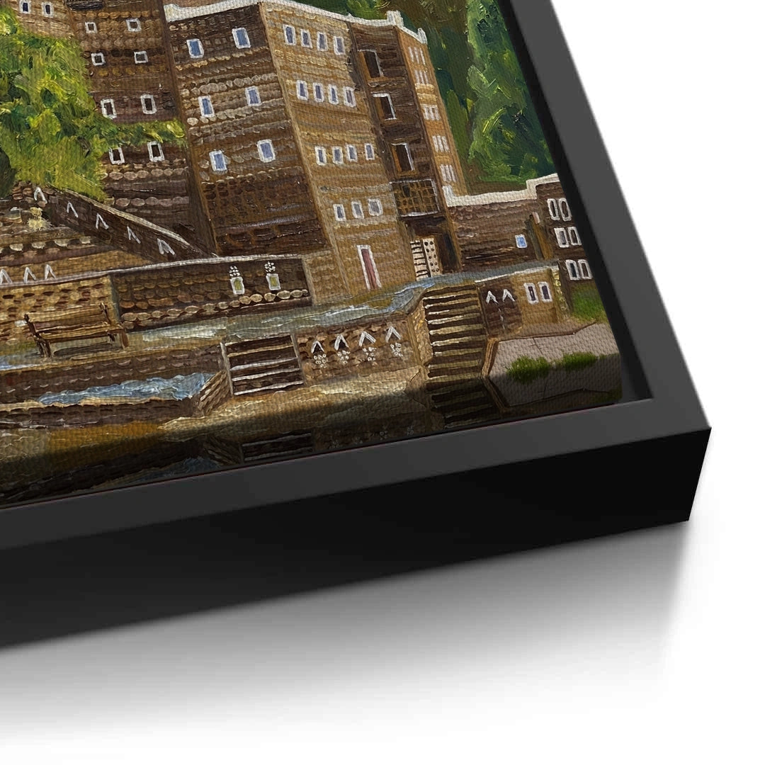 The soulful Rijal Almaa Heritage Village print captures the timeless beauty of one of Saudi Arabia’s most treasured cultural landmarks. This artwork features the iconic multi-story stone dwellings of the Asir region, famously known for their hand-built stone walls and contrasting white window frames. Rendered in a rich impressionistic painterly style, the village is nestled against a backdrop of lush green mountains under a soft, expressive sky. This piece brings a sense of history, serenity, and majestic tradition to any interior. Ideal for adding a sophisticated, cultural, and historic touch to a living room, library, or executive office in Dubai or across the Middle East.