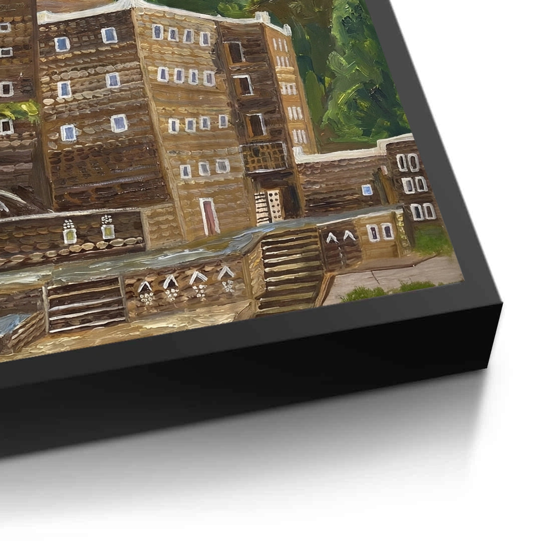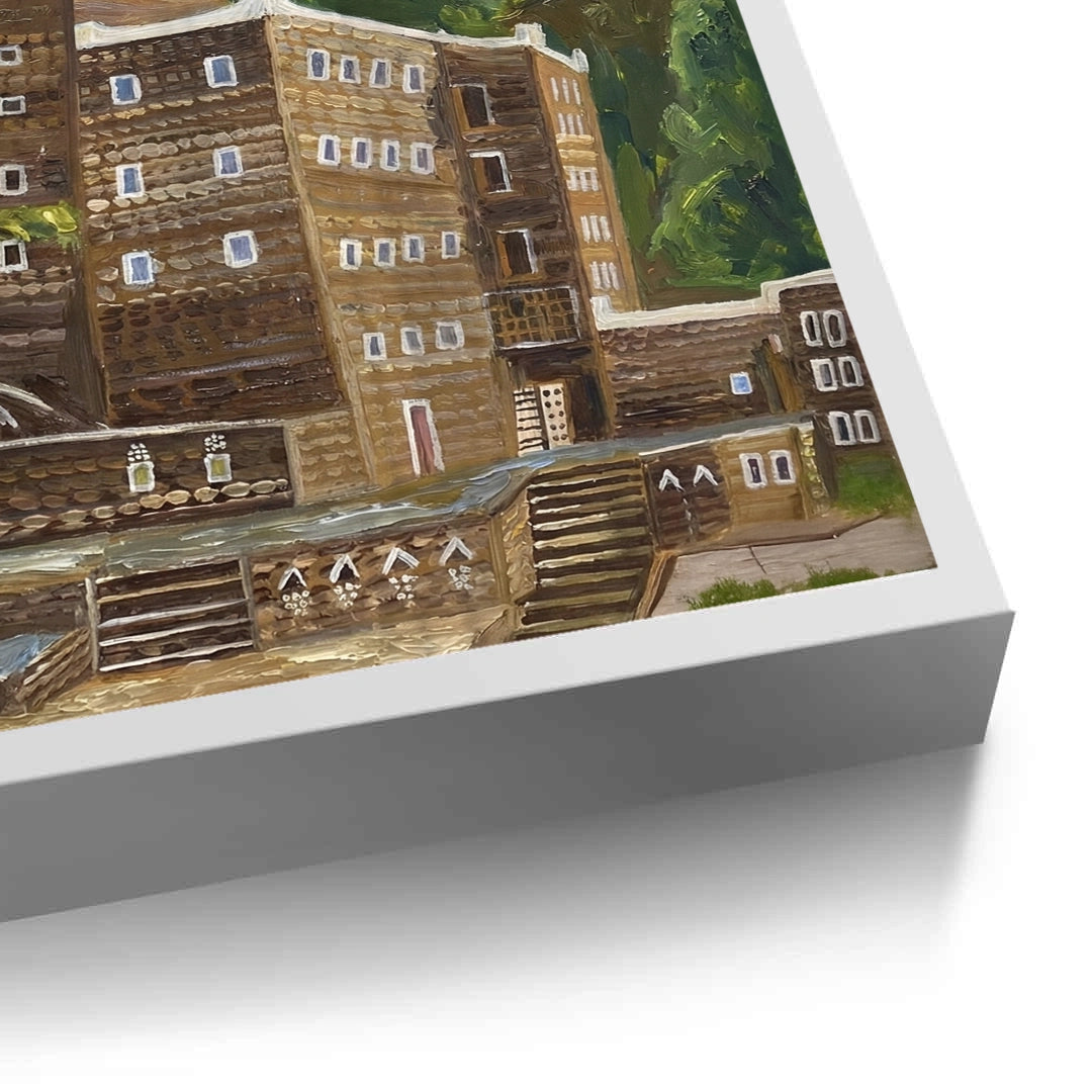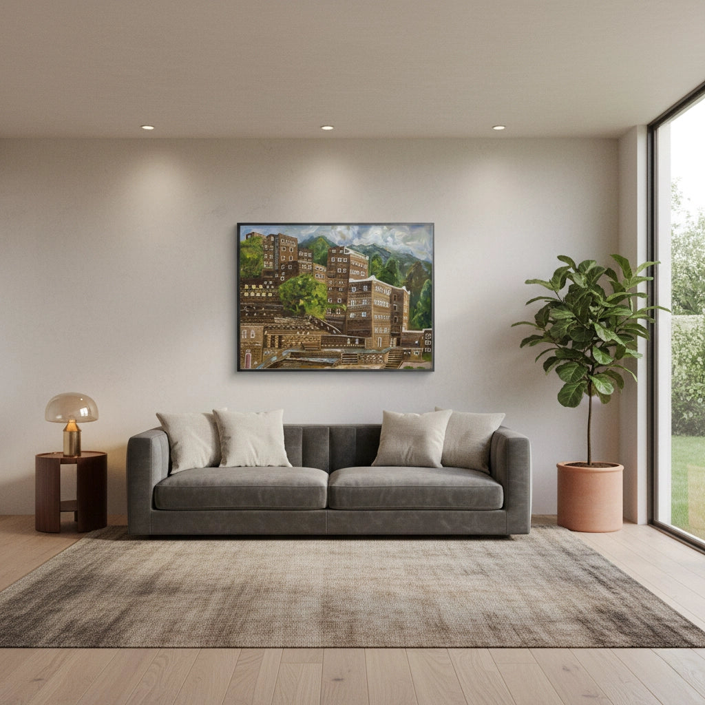 The soulful Rijal Almaa Heritage Village print captures the timeless beauty of one of Saudi Arabia’s most treasured cultural landmarks. This artwork features the iconic multi-story stone dwellings of the Asir region, famously known for their hand-built stone walls and contrasting white window frames. Rendered in a rich impressionistic painterly style, the village is nestled against a backdrop of lush green mountains under a soft, expressive sky. This piece brings a sense of history, serenity, and majestic tradition to any interior. Ideal for adding a sophisticated, cultural, and historic touch to a living room, library, or executive office in Dubai or across the Middle East.