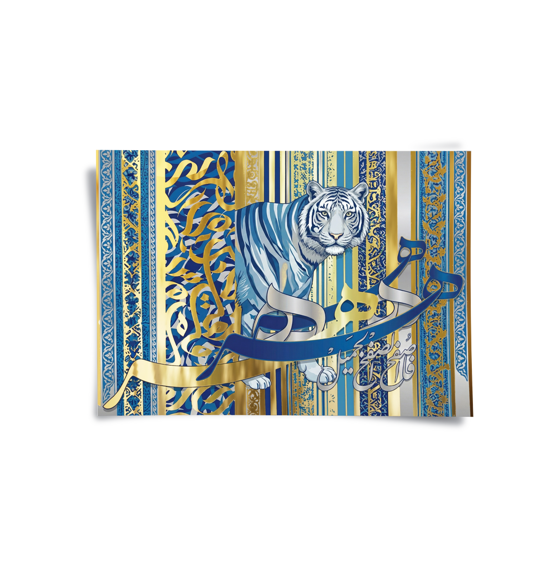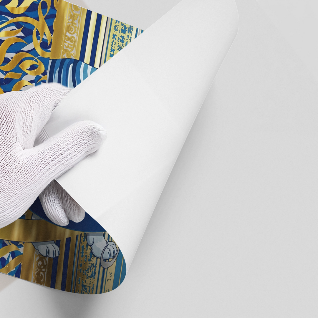 The opulent Royal Feroza - Gold Script Fusion print is a dazzling combination of colour and script. This piece showcases fluid, sweeping metallic gold Arabic calligraphy that dominates the center, set against a deep, marbled Feroza (teal/turquoise blue) canvas. The background's rich texture and hidden blue script details enhance the majestic shine of the gold. This royal blue and gold palette offers a luxurious, sophisticated, and spiritually evocative focal point. Ideal for adding depth and opulence to a contemporary majlis or luxury living room in Dubai.