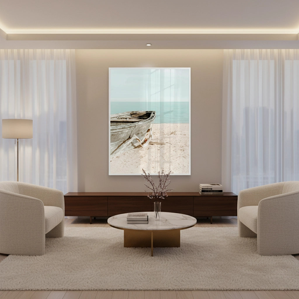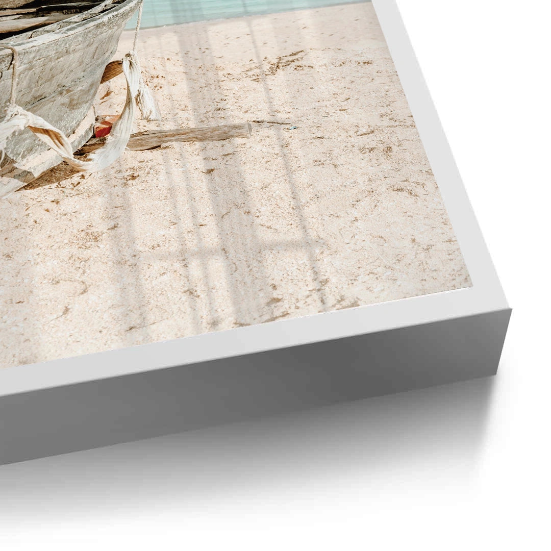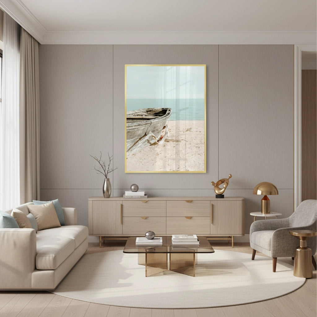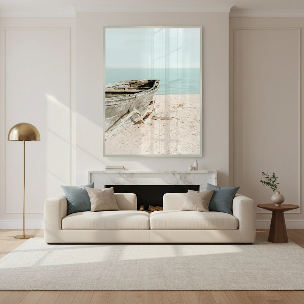 The tranquil Rustic Boat print captures the quiet solitude of the seaside. This canvas features a weathered, old wooden boat resting on a soft, sun-drenched beach. The background is a calming blend of pale turquoise water and a light blue sky. The focus on texture, light, and minimal subject matter creates an atmosphere of peaceful contemplation and elegant coastal charm. It is an ideal piece for adding a touch of timeless serenity and seaside character to any home or office in Dubai.