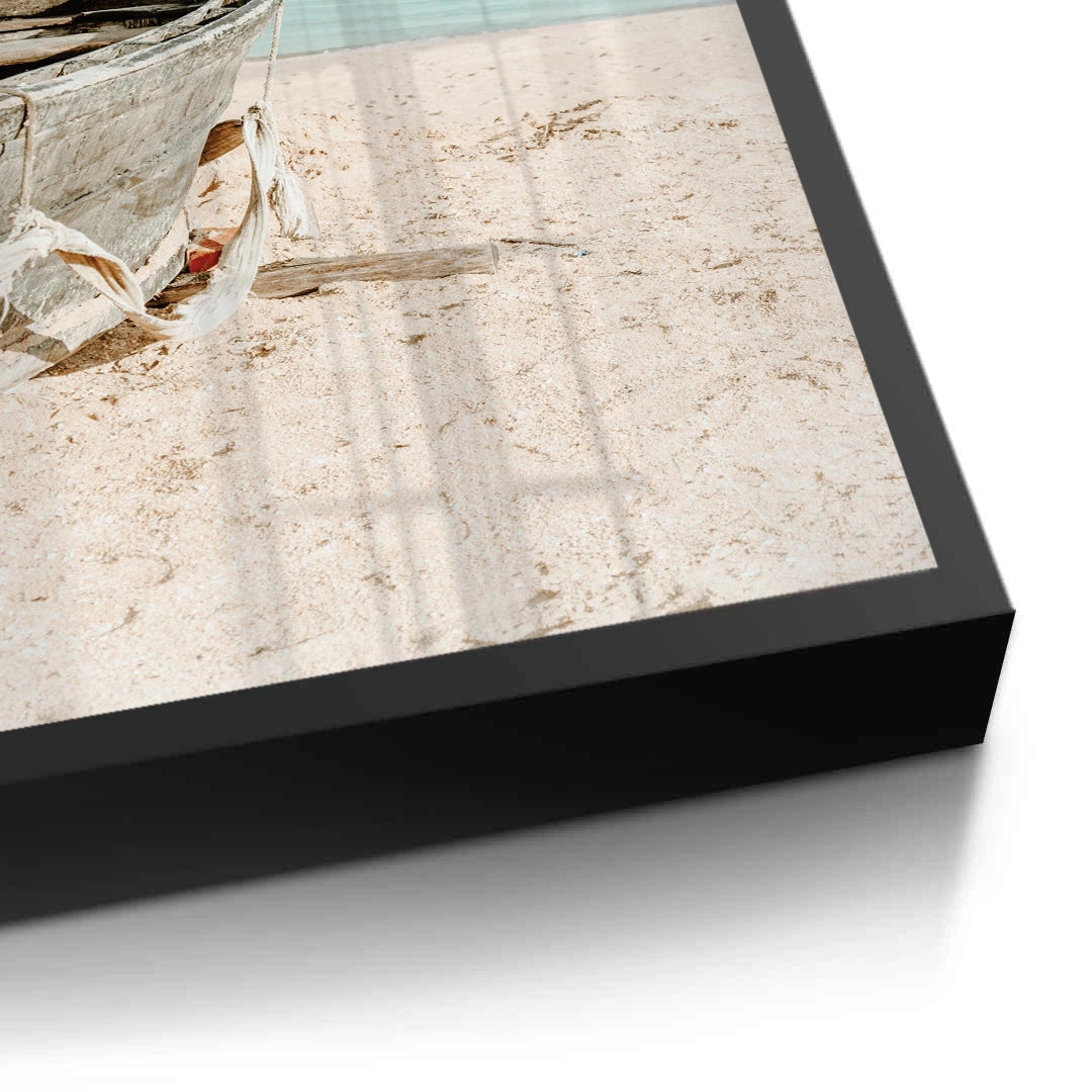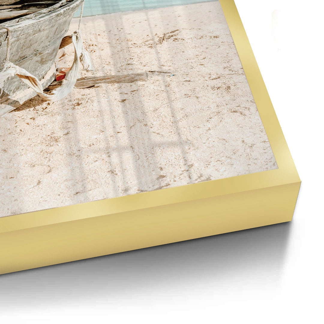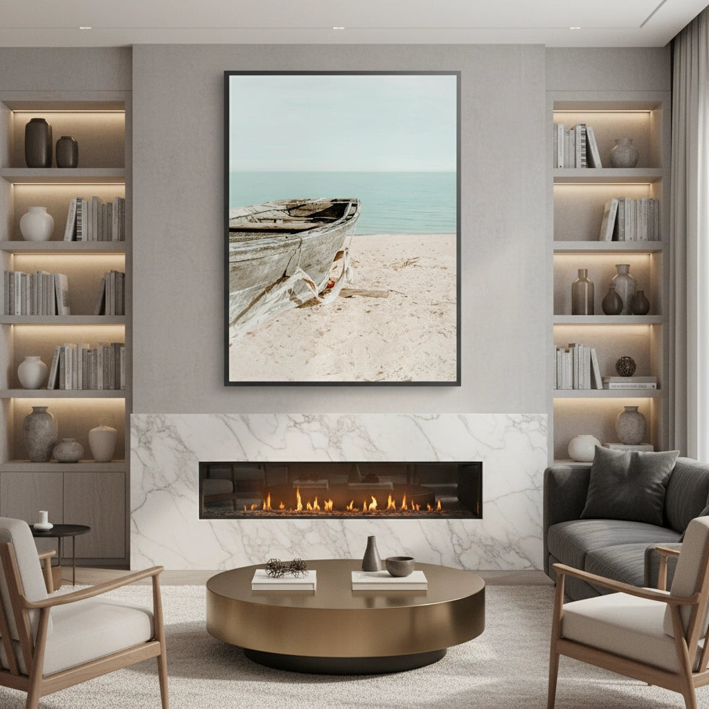 The tranquil Rustic Boat print captures the quiet solitude of the seaside. This canvas features a weathered, old wooden boat resting on a soft, sun-drenched beach. The background is a calming blend of pale turquoise water and a light blue sky. The focus on texture, light, and minimal subject matter creates an atmosphere of peaceful contemplation and elegant coastal charm. It is an ideal piece for adding a touch of timeless serenity and seaside character to any home or office in Dubai.