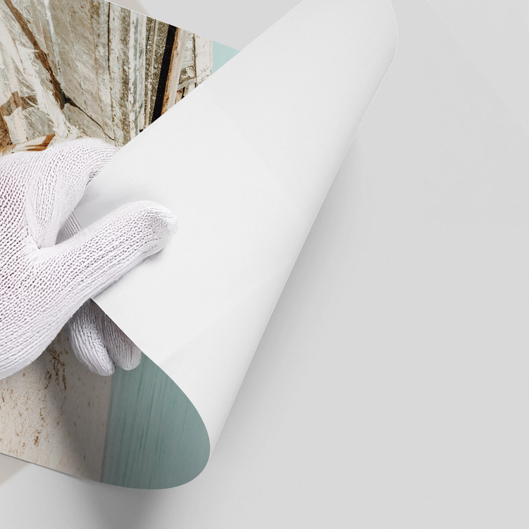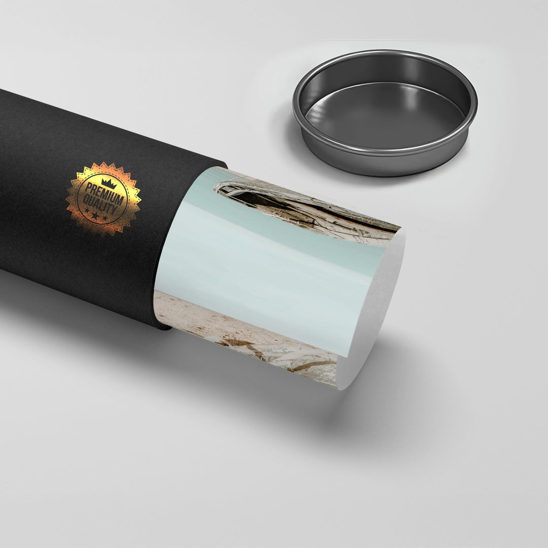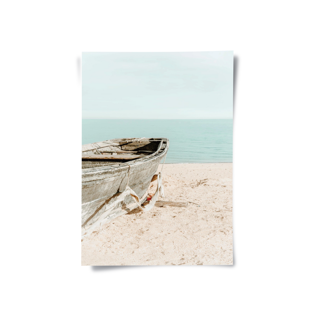 The tranquil Rustic Boat print captures the quiet solitude of the seaside. This canvas features a weathered, old wooden boat resting on a soft, sun-drenched beach. The background is a calming blend of pale turquoise water and a light blue sky. The focus on texture, light, and minimal subject matter creates an atmosphere of peaceful contemplation and elegant coastal charm. It is an ideal piece for adding a touch of timeless serenity and seaside character to any home or office in Dubai.