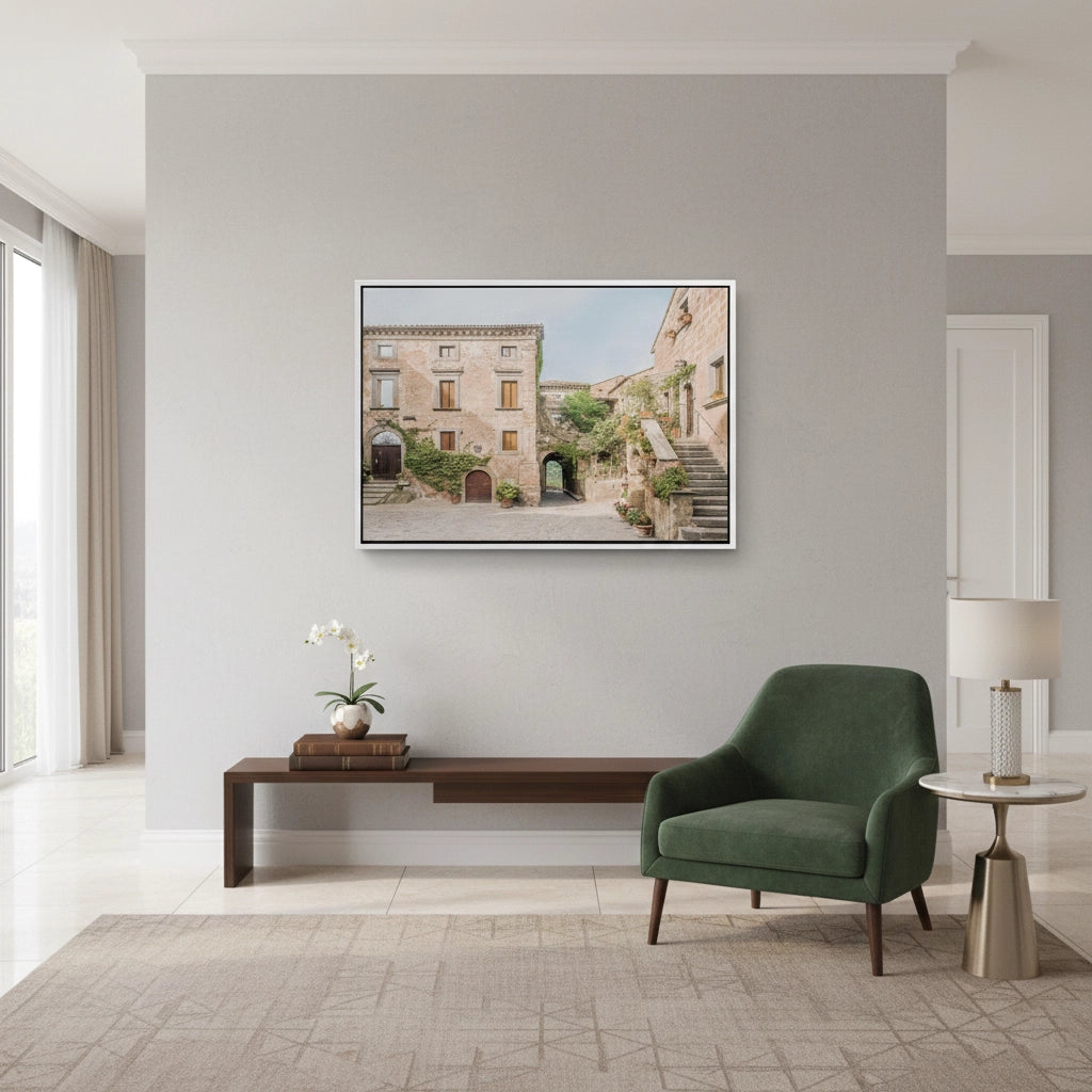 Transport your home to the heart of Tuscany with the Rustic Italian Village art print. This evocative architectural piece captures a serene courtyard with sun-warmed stone buildings, wooden shutters, and flower-lined stairways. The soft textures of climbing ivy and the quiet charm of the narrow alleys evoke a sense of Mediterranean nostalgia and peace. Finished with our signature premium vertical texture, this print offers a high-end tactile finish that brings depth to the historic details. It is the perfect focal point for a cozy dining area, a classic study, or a sophisticated living space in Dubai.