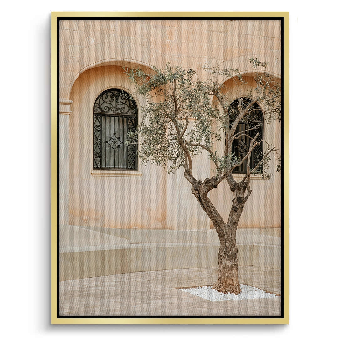 Bring the soul of the Mediterranean into your home with the Rustic Stone Courtyard art print. This serene architectural piece features classical arched windows with intricate ironwork, set against sun-warmed stone walls. The presence of a graceful olive tree planted in a bed of white pebbles adds a touch of organic life and peace to the composition. Finished with our signature premium vertical texture, this artwork combines earthy tones with high-end craftsmanship. It is the perfect statement for a minimalist sanctuary, a warm dining area, or a sophisticated courtyard-inspired interior in Dubai.