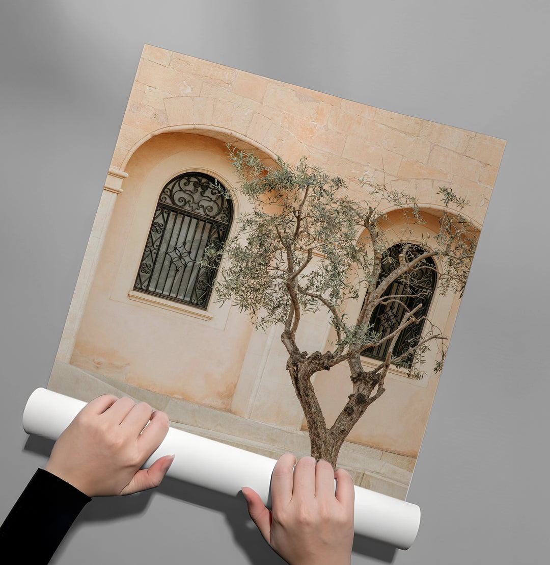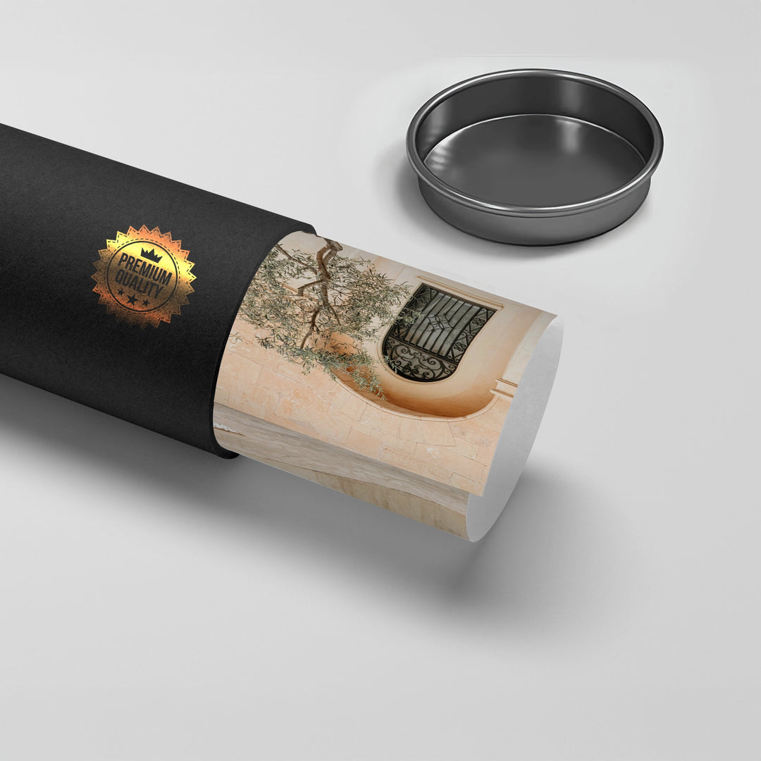 Bring the soul of the Mediterranean into your home with the Rustic Stone Courtyard art print. This serene architectural piece features classical arched windows with intricate ironwork, set against sun-warmed stone walls. The presence of a graceful olive tree planted in a bed of white pebbles adds a touch of organic life and peace to the composition. Finished with our signature premium vertical texture, this artwork combines earthy tones with high-end craftsmanship. It is the perfect statement for a minimalist sanctuary, a warm dining area, or a sophisticated courtyard-inspired interior in Dubai.