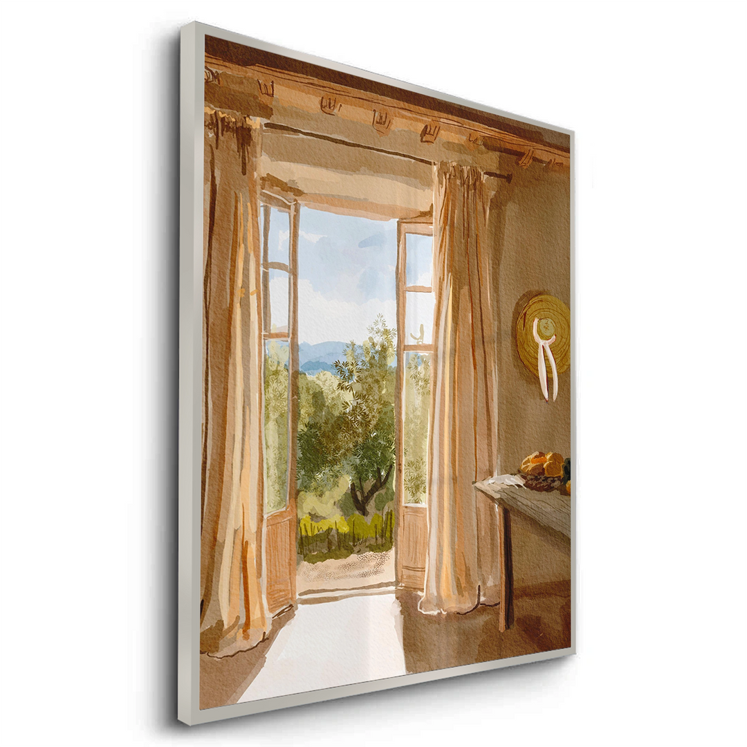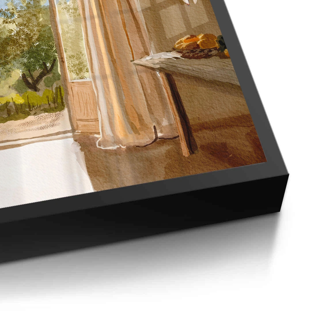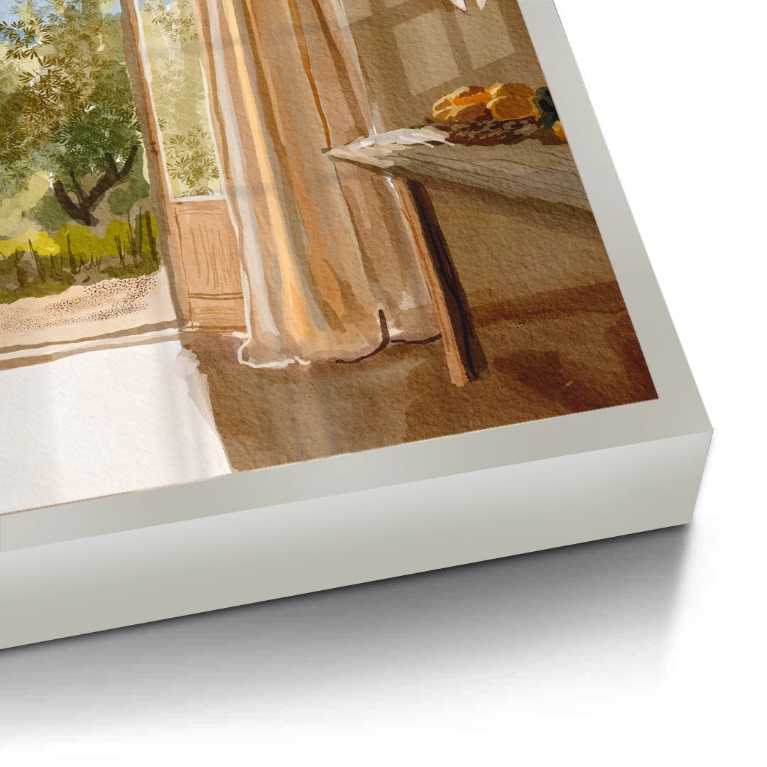 The charming Rustic Tuscan Villa print captures the idyllic beauty of the Italian countryside. This exquisite watercolor-style artwork depicts a cozy, sunlit room with open French doors, revealing a lush green valley and rolling hills beyond. The warm, earthy tones of the interior, along with simple details like sheer curtains and a straw hat, evoke a feeling of peaceful, timeless European escape. It is an exceptional piece for adding traditional warmth and scenic depth to a kitchen, dining area, or living room in Dubai.