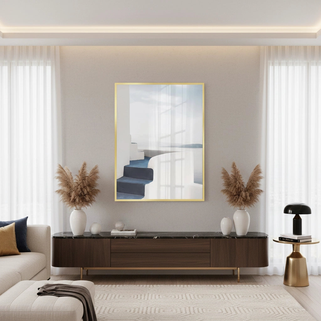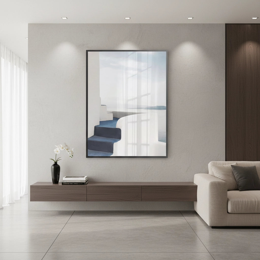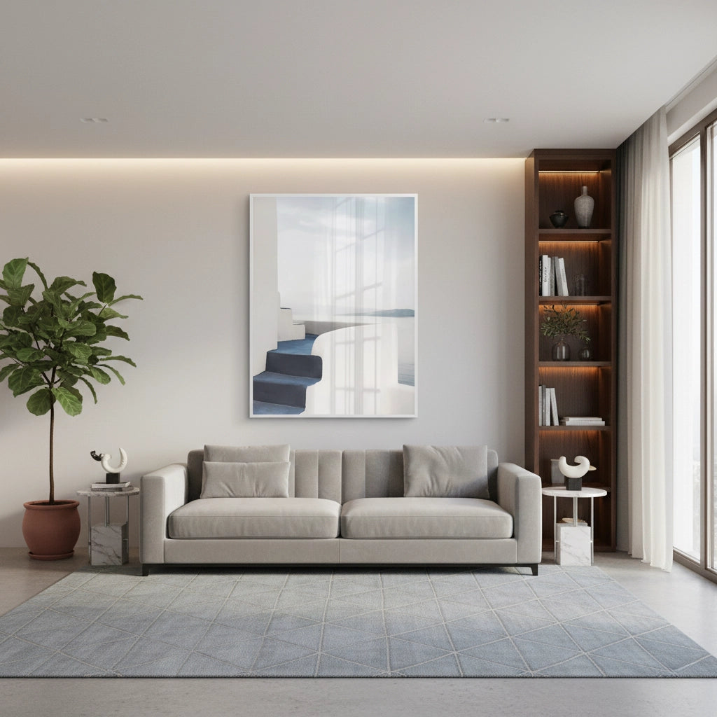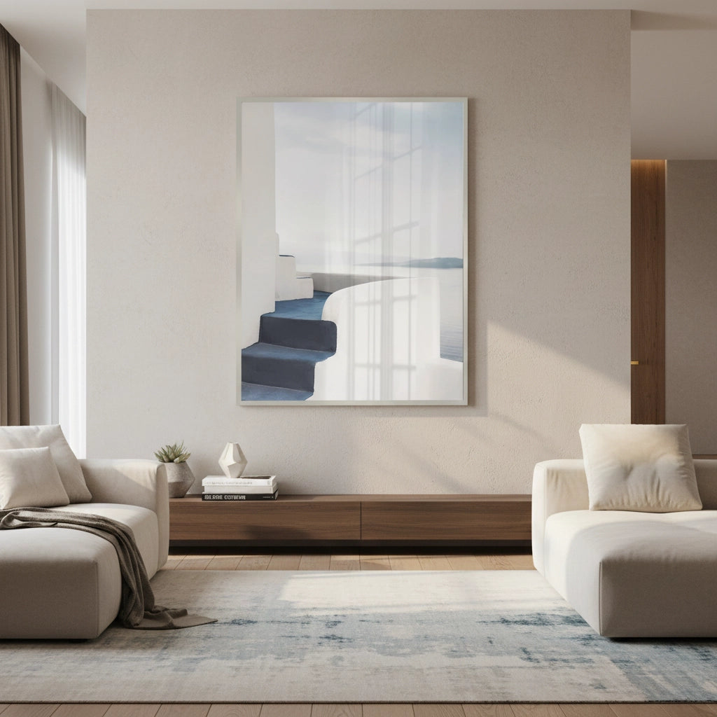 Refresh your interior with the serene Santorini Blue Stairs print, a stunning piece of minimalist architectural art. This artwork captures the iconic essence of Greece, featuring vibrant blue steps winding through crisp, white-washed walls. The composition flows into a soft, misty coastal horizon, bringing a breath of fresh Mediterranean air to your walls. Finished with a premium vertical texture, this print offers a sophisticated, high-end feel. It is the perfect choice for adding a modern, calming, and coastal vibe to a bright living room, a contemporary bedroom, or a chic office space in Dubai.