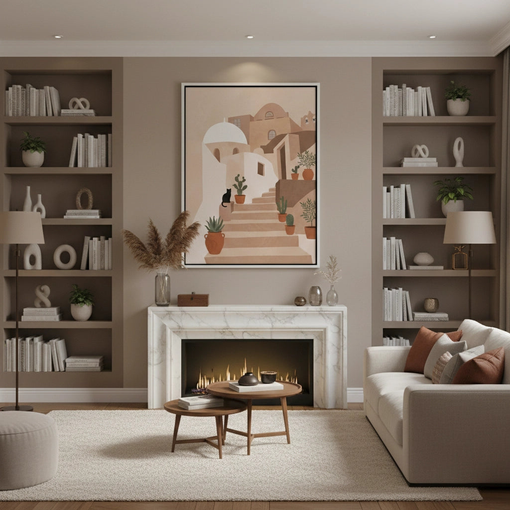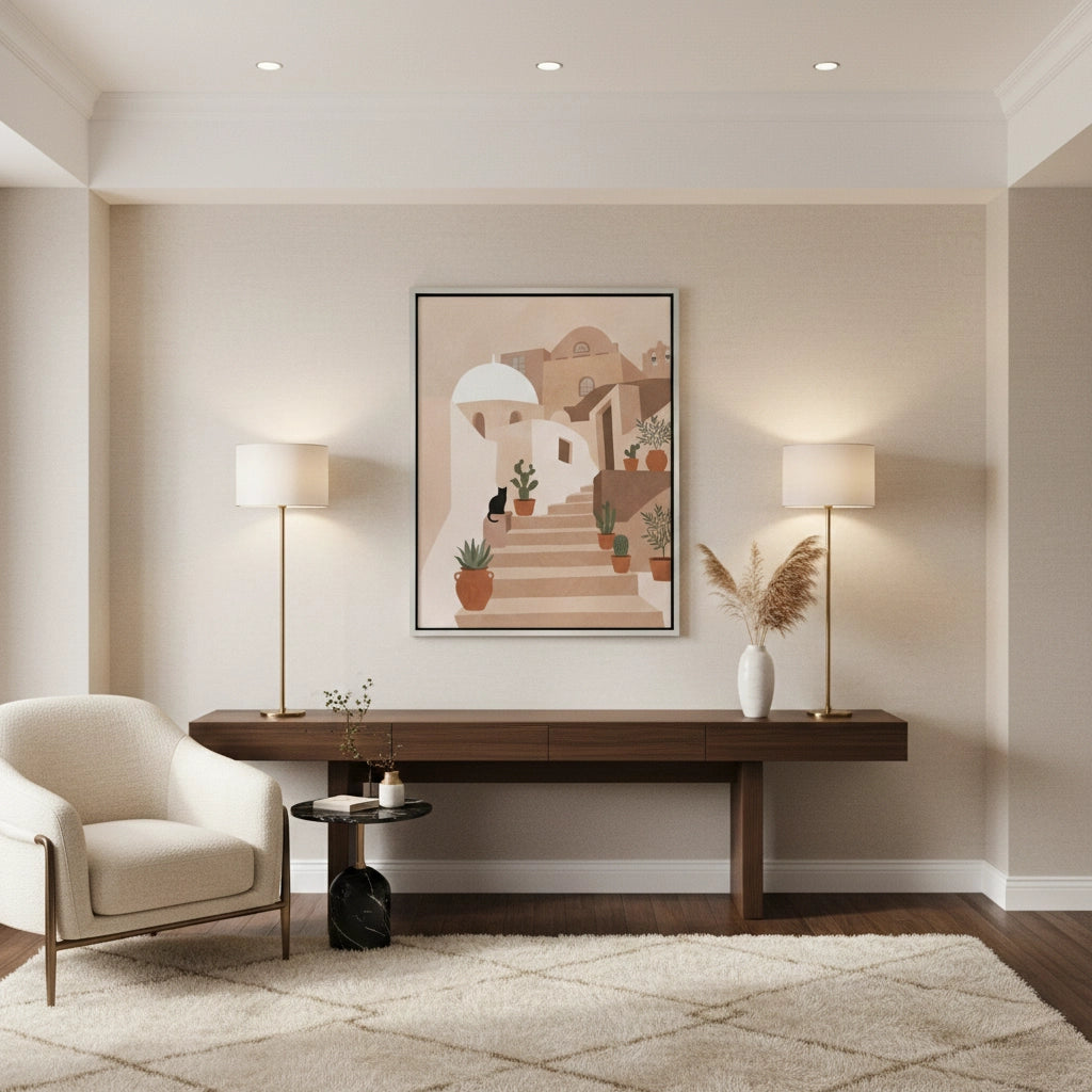 Bring the sun-drenched charm of Greece into your home with the Santorini Stairway from Jasmine Art’s Bohemian series. This enchanting print captures the serene beauty of Santorini’s winding steps, dotted with terracotta cactus pots and a solitary black cat. Its warm palette of beige and rust creates a cozy, inviting atmosphere that celebrates wanderlust and minimalist design. Finished with our signature premium vertical texture, this print offers exceptional tactile depth and a high-end gallery finish. A perfect wanderlust-inspired piece for a modern lounge, bedroom, or hallway in Dubai.