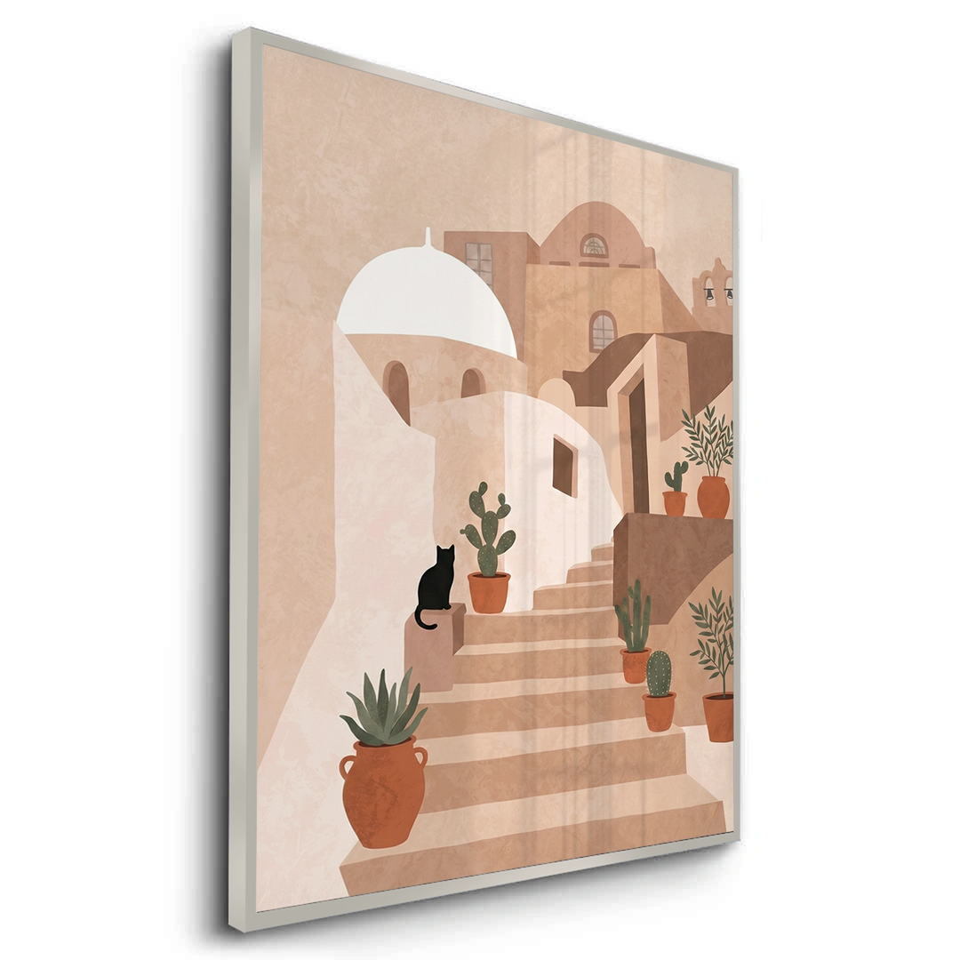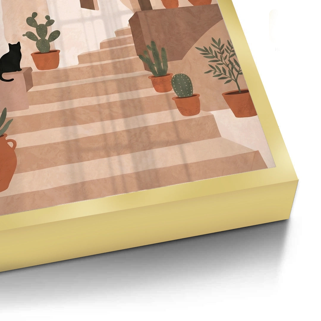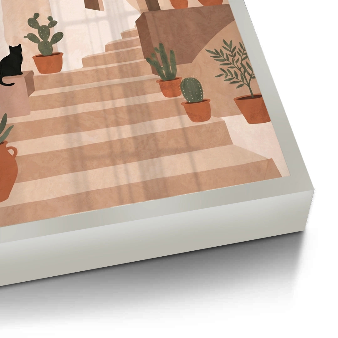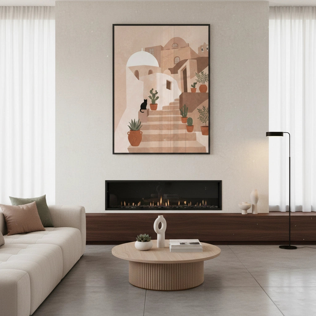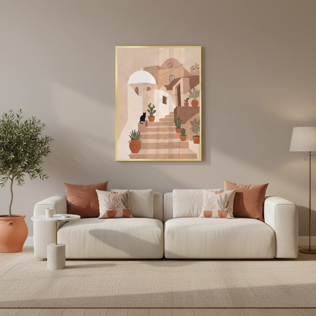 Bring the sun-drenched charm of Greece into your home with the Santorini Stairway from Jasmine Art’s Bohemian series. This enchanting print captures the serene beauty of Santorini’s winding steps, dotted with terracotta cactus pots and a solitary black cat. Its warm palette of beige and rust creates a cozy, inviting atmosphere that celebrates wanderlust and minimalist design. Finished with our signature premium vertical texture, this print offers exceptional tactile depth and a high-end gallery finish. A perfect wanderlust-inspired piece for a modern lounge, bedroom, or hallway in Dubai.