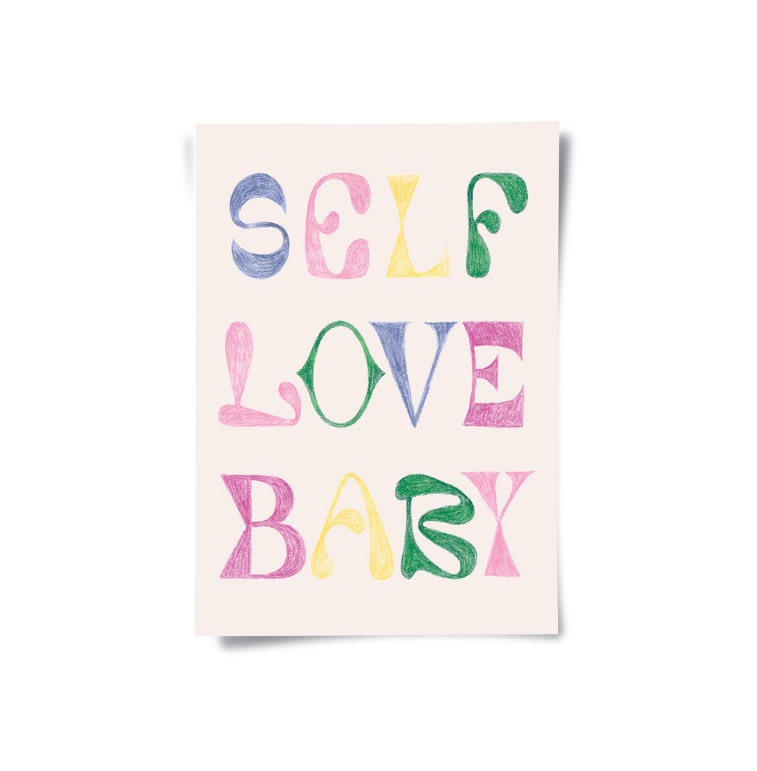 The playful Self Love Baby - Vibrant Retro Typography print is a joyful affirmation designed to spread positivity. The message "SELF LOVE BABY" is boldly displayed in a chunky, retro-inspired Serif font. Each letter is individually colored in a vibrant, childlike crayon or pencil texture, featuring shades of blue, pink, yellow, and green. Set against a soft, textured cream background, this artwork brings a fun, youthful, and motivational energy. Ideal for a teenager's room, creative studio, or a playful corner in a modern home in Dubai.
