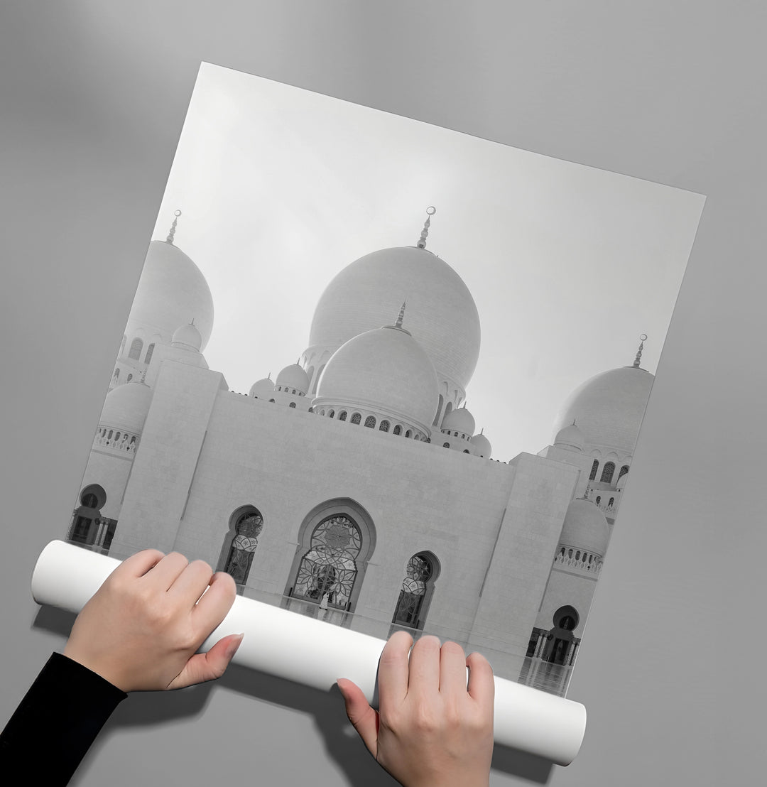 Celebrate the spiritual and architectural majesty of Abu Dhabi with the Sheikh Zayed Grand Mosque art print. This stunning black and white photograph captures the perfect symmetry of the mosque’s iconic white domes and intricate marble arches. The minimalist composition and soft monochrome tones evoke a sense of deep peace and timeless elegance. Finished with our signature premium vertical texture, this print offers a high-end tactile finish that highlights the pristine beauty of the Islamic design. A perfect statement piece for a tranquil prayer room, a sophisticated study, or a luxury home in Dubai.