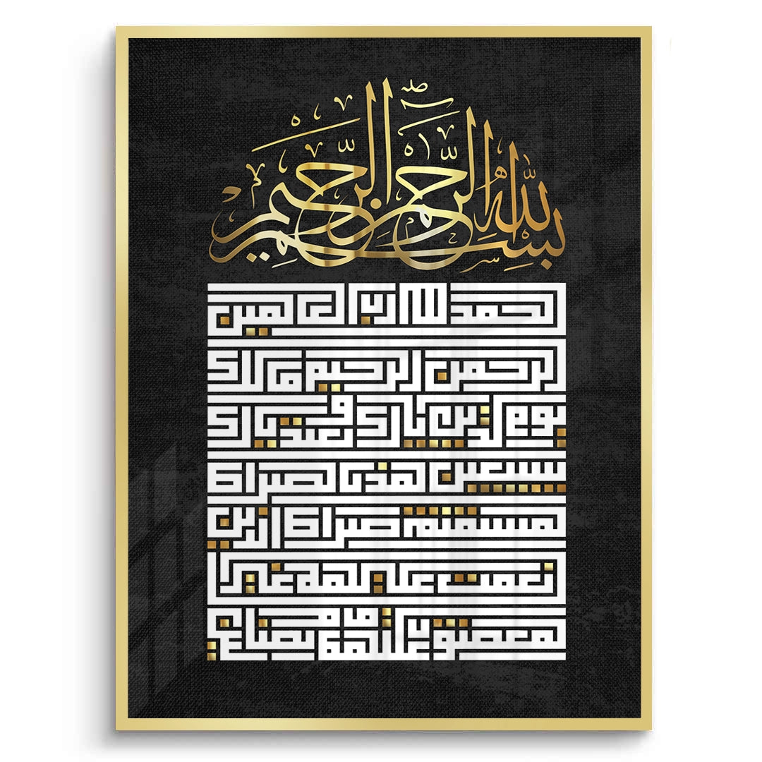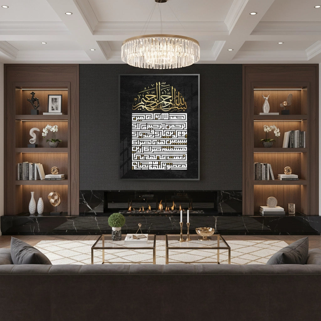 Bring divine order and modern sophistication to your home with the Square Kufic Al-Fatiha from Jasmine Art’s Arabic Calligraphy collection. This masterpiece features the entirety of Surah Al-Fatiha rendered in intricate Square Kufic geometry, crowned by a radiant golden "Bismillah" in elegant Thuluth script. The striking contrast of white and gold against a textured black backdrop creates a powerful spiritual focal point. Finished with our signature premium texture, this print offers exceptional tactile depth and a high-end gallery finish. A perfect statement piece for a contemporary Majlis, a formal dining area, or a luxury office in Dubai.