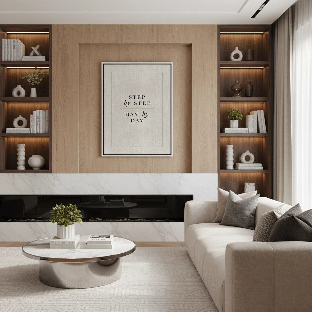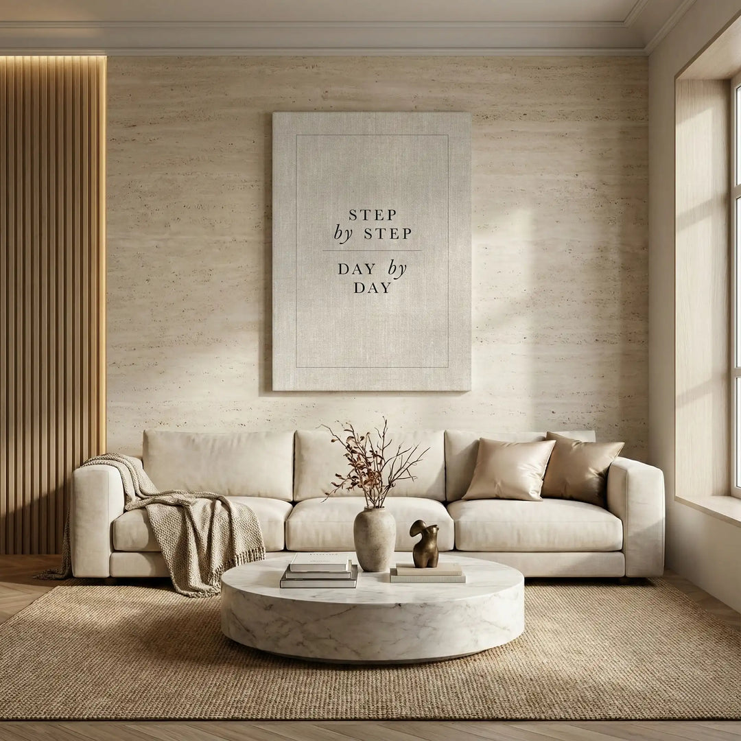 The tranquil Step By Step Day By Day - Minimalist Typography print is a perfect, calming reminder of progress and patience. The motivational mantra is rendered in a refined mix of classic black Serif typography and elegant script font, emphasizing a steady approach to life. The design is subtly framed by minimalist black lines and set against a soft, textured natural linen canvas. This clean, sophisticated artwork is ideal for adding a calming, minimalist, and reflective accent to a bedroom, office, or reading nook in Dubai.