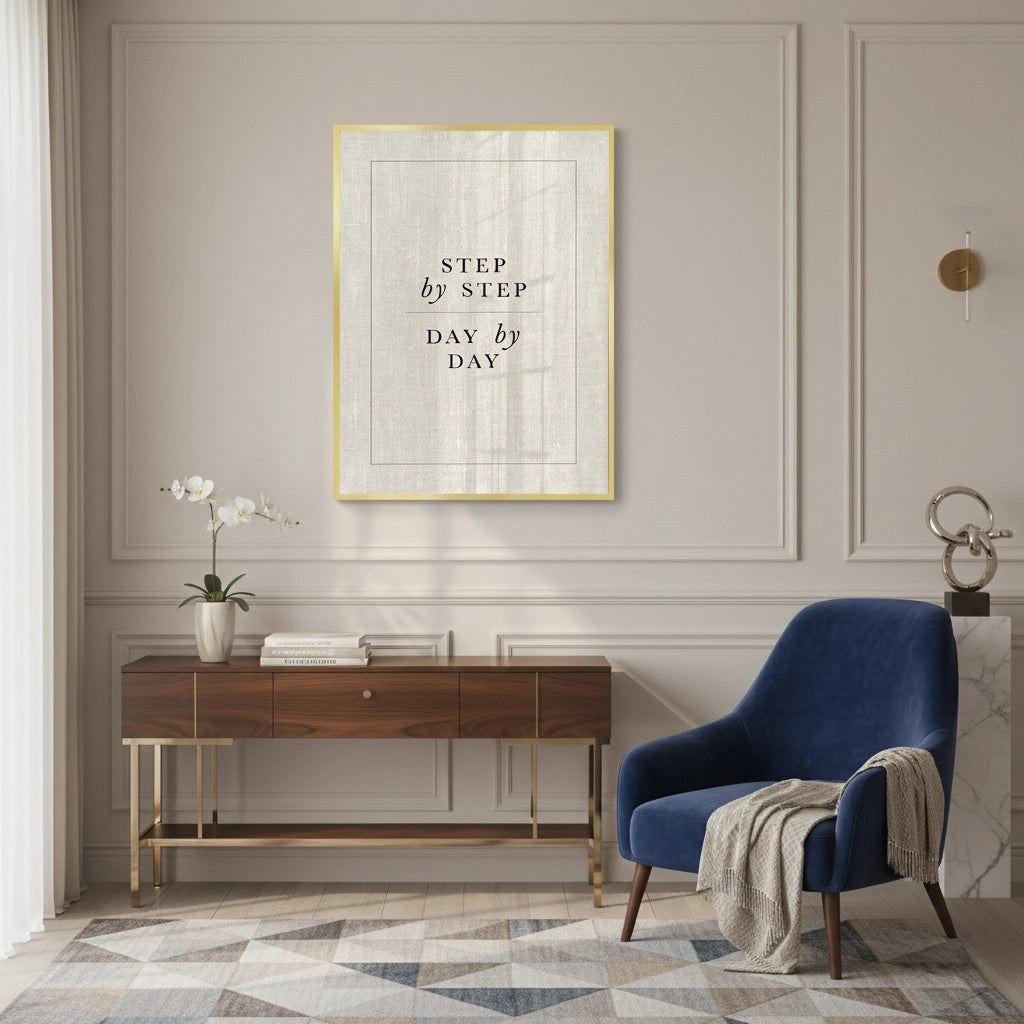 The tranquil Step By Step Day By Day - Minimalist Typography print is a perfect, calming reminder of progress and patience. The motivational mantra is rendered in a refined mix of classic black Serif typography and elegant script font, emphasizing a steady approach to life. The design is subtly framed by minimalist black lines and set against a soft, textured natural linen canvas. This clean, sophisticated artwork is ideal for adding a calming, minimalist, and reflective accent to a bedroom, office, or reading nook in Dubai.