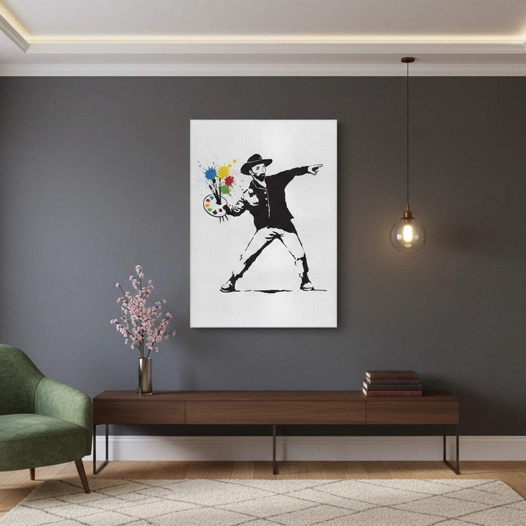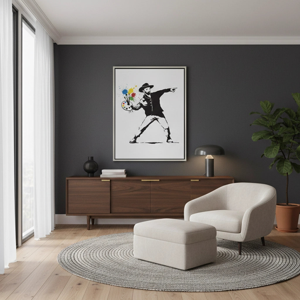 Celebrate the power of creativity with the Van Gogh Palette from Jasmine Art’s Banksy series. This unique print reimagines the classical master in a bold street-art pose, wielding a colorful palette against a clean, textured backdrop. The striking contrast of the black-and-white silhouette and vibrant paint splatters makes it a powerful focal point for any modern interior. Finished with our signature premium vertical texture, this print offers exceptional tactile depth and a high-end gallery finish. A perfect statement piece for a creative studio, a home library, or a contemporary lounge in Dubai.
