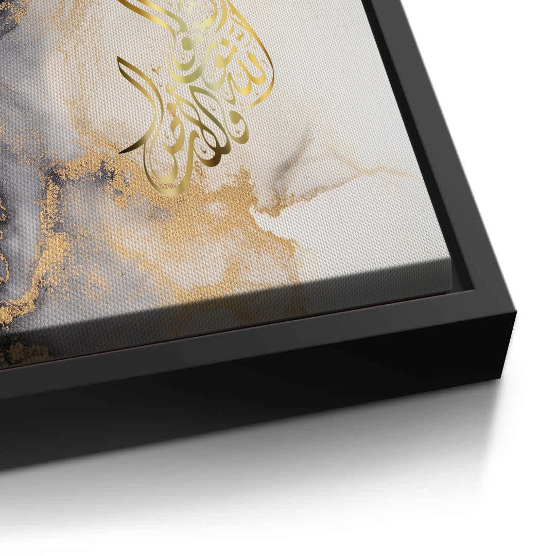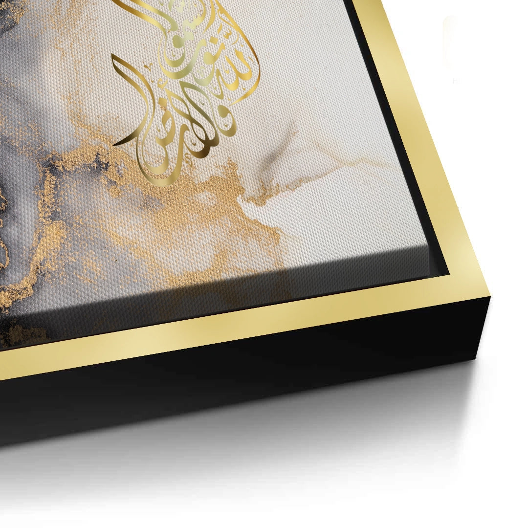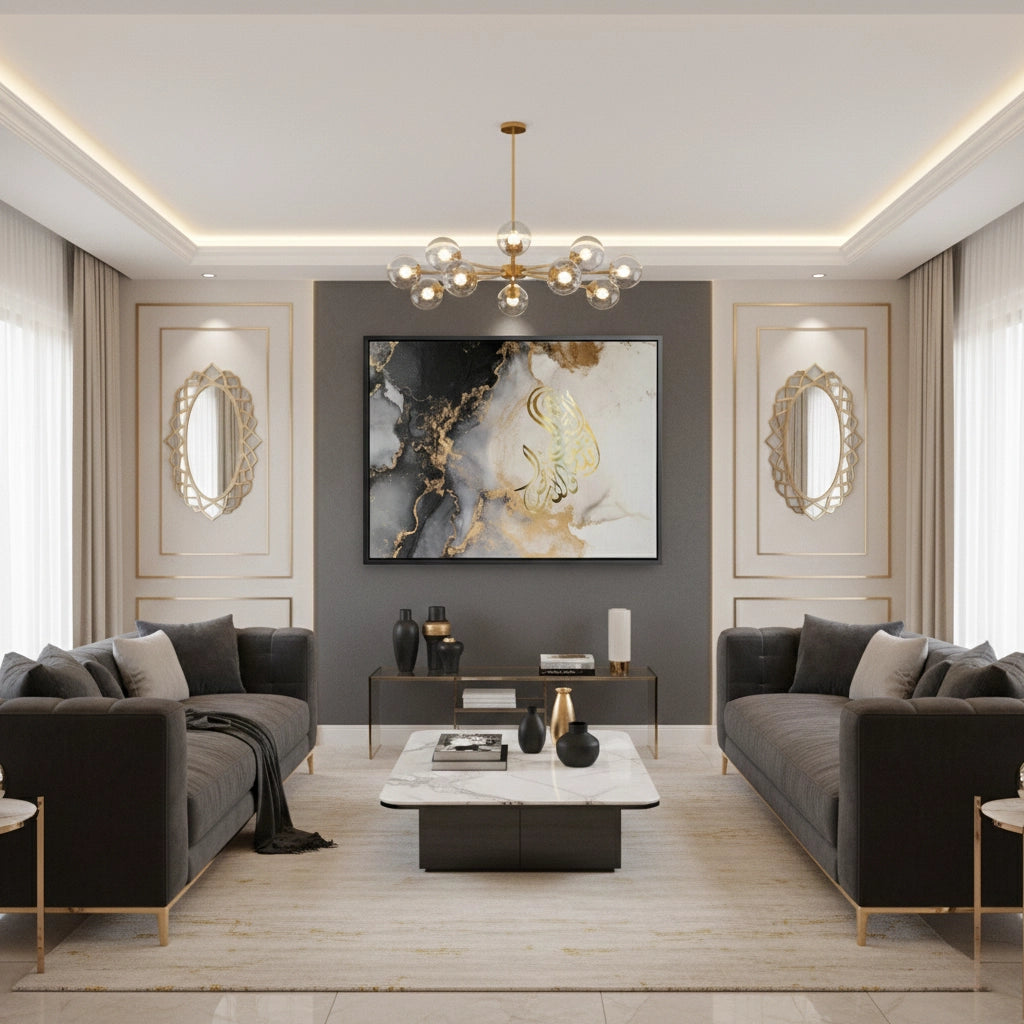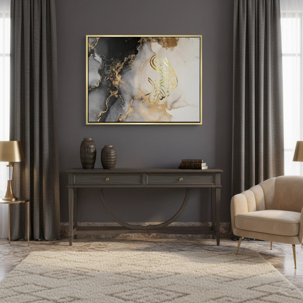 The ethereal SubhanAllah - Gold Script in Marble Flow print is a stunning example of contemporary spiritual abstract art. The phrase 'SubhanAllah' is rendered in luminous, fluid metallic gold Arabic calligraphy, forming an organic shape that commands attention. The backdrop features a dramatic, high-contrast marble or alcohol ink effect, where deep black and grey swirls blend with bright white canvas, all subtly dusted with shimmering gold accents. This piece captures the essence of spiritual serenity and opulent, modern design. It is the perfect luxurious statement piece for a contemporary living space in Dubai.