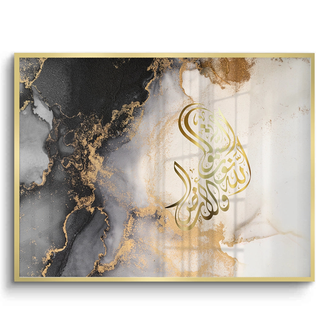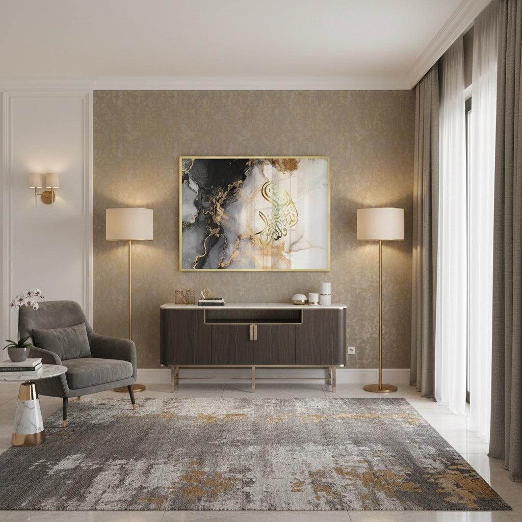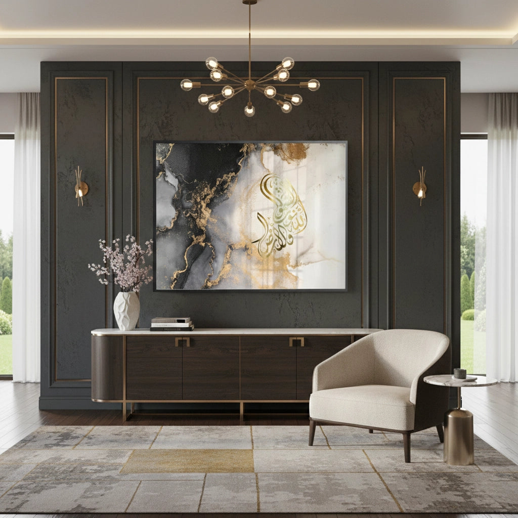 The ethereal SubhanAllah - Gold Script in Marble Flow print is a stunning example of contemporary spiritual abstract art. The phrase 'SubhanAllah' is rendered in luminous, fluid metallic gold Arabic calligraphy, forming an organic shape that commands attention. The backdrop features a dramatic, high-contrast marble or alcohol ink effect, where deep black and grey swirls blend with bright white canvas, all subtly dusted with shimmering gold accents. This piece captures the essence of spiritual serenity and opulent, modern design. It is the perfect luxurious statement piece for a contemporary living space in Dubai.