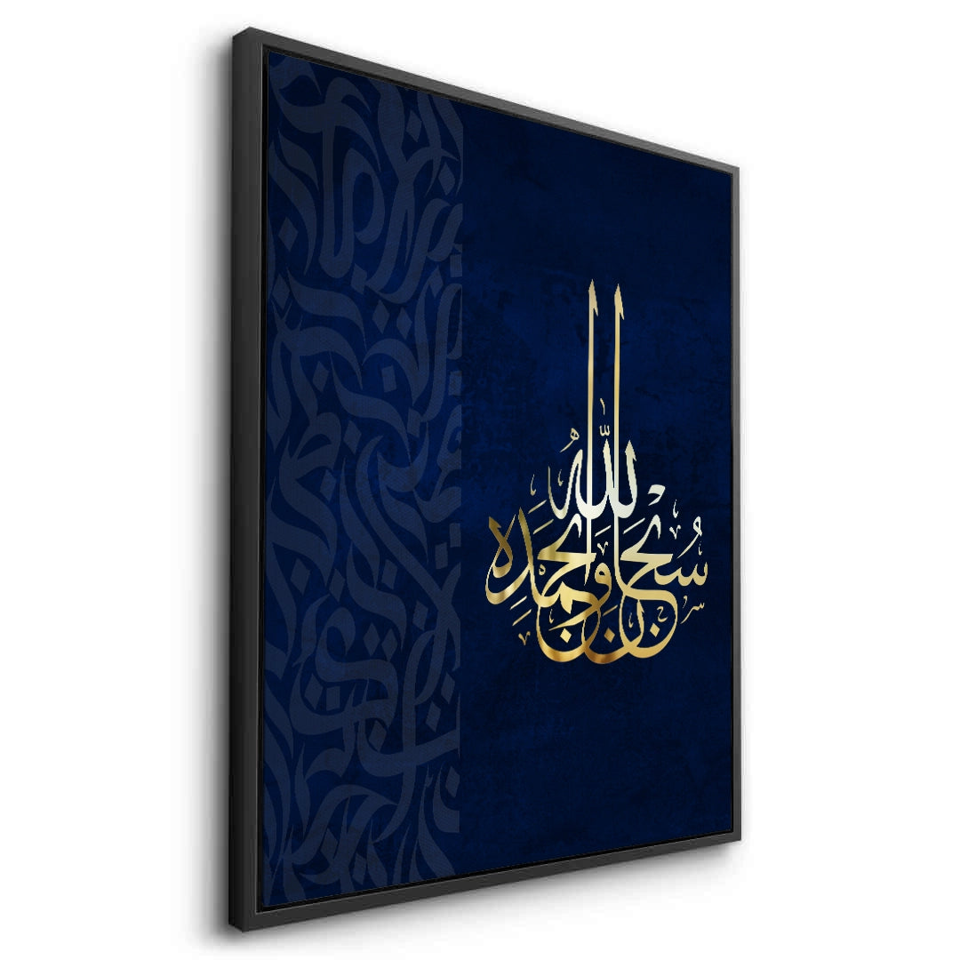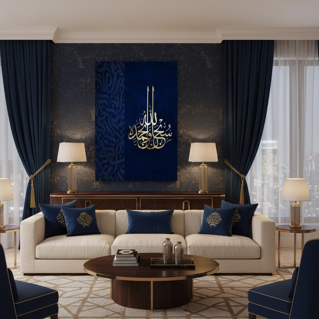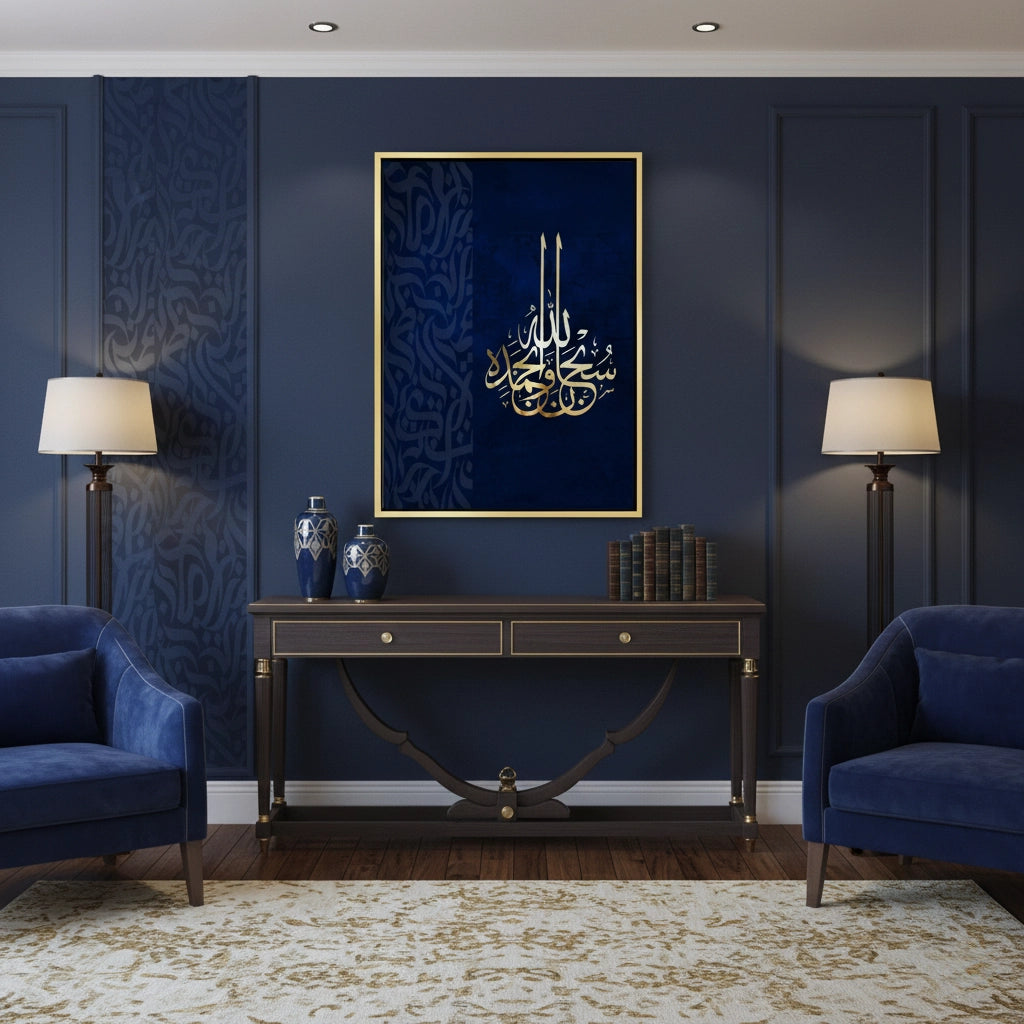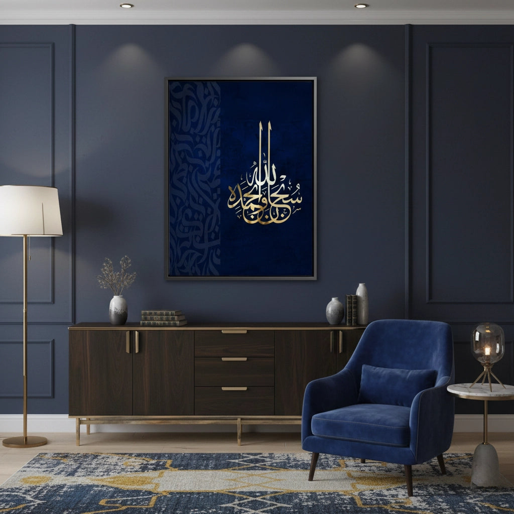 Elevate your sanctuary with Celestial Praise from Jasmine Art’s Arabic Calligraphy collection. This breathtaking masterpiece features the sacred tasbeeh "SubhanAllah wa bi-Hamdihi" rendered in radiant metallic gold script against a deep midnight blue backdrop. The composition blends traditional sacred script with a modern vertical-ribbed texture, creating a powerful spiritual anchor for any space. Finished with our signature premium vertical-ribbed texture, this print offers exceptional tactile depth and a luxury gallery finish. A majestic centerpiece for a formal Majlis, a luxury living room, or a serene prayer space in Dubai.