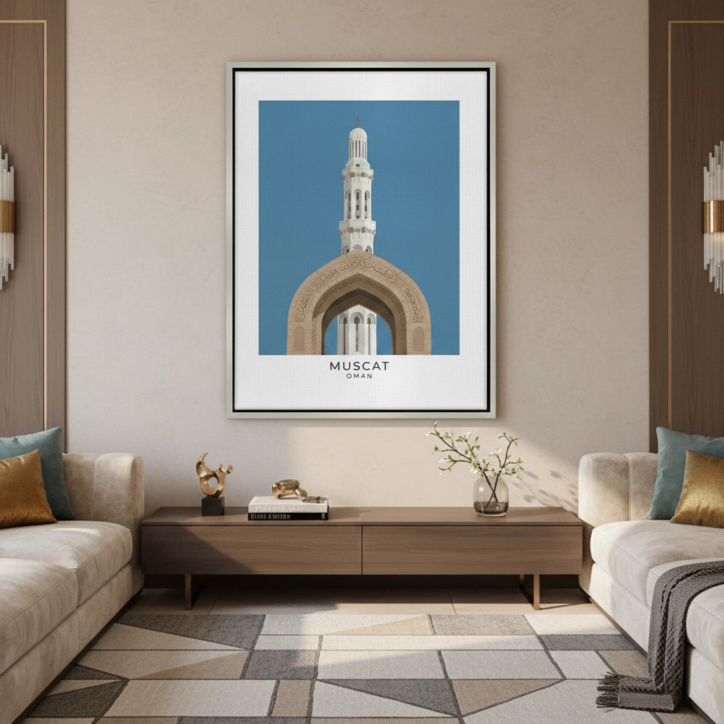 Celebrate the majestic beauty of Omani craftsmanship with the Sultan Qaboos Grand Mosque art print. This minimalist illustration captures the soaring minaret and the intricate calligraphy-adorned archway of Muscat’s iconic landmark. The clean composition and the contrast of sandstone tones against a deep blue sky evoke a sense of spiritual peace and architectural brilliance. Finished with our signature premium vertical texture, this print offers a high-end tactile finish that adds a sophisticated depth to your walls. A perfect choice for a serene home office, a traditional majlis, or a contemporary living space in Muscat or Dubai.