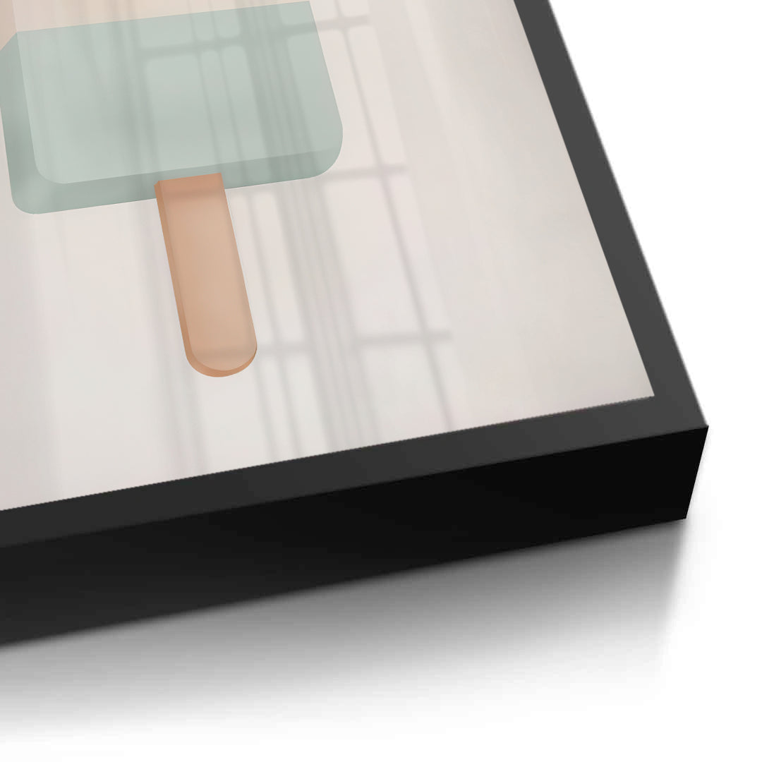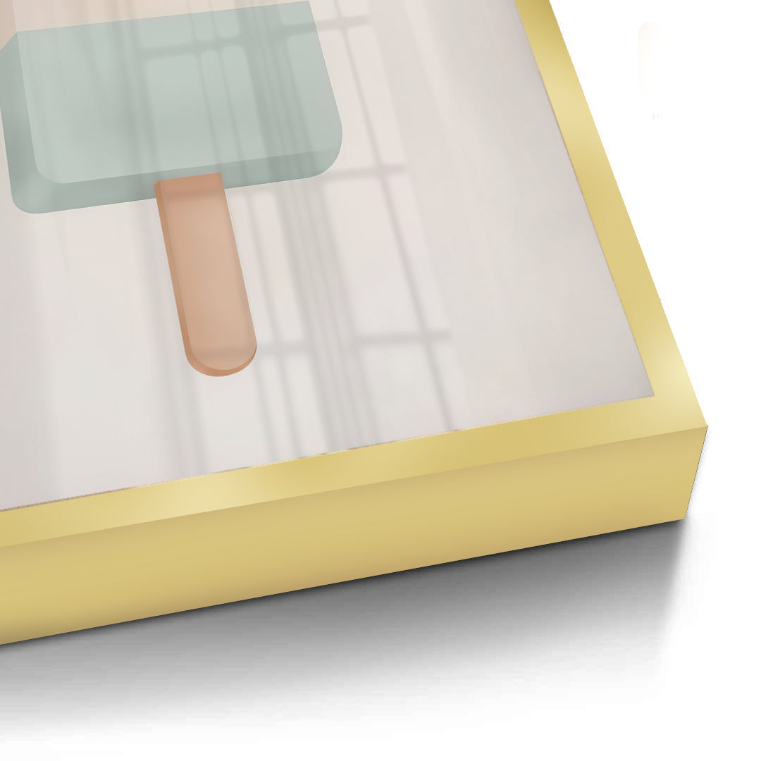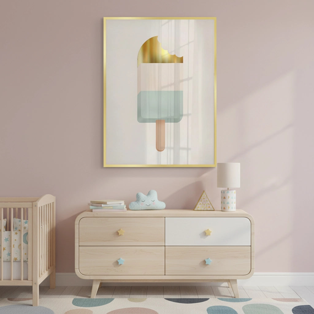 The chic Summer Sweets print is a perfect blend of fun pop art and luxurious modern design for a child's space. This piece features a minimalist, color-blocked popsicle with a whimsical bite mark. The top segment is rendered in dazzling metallic gold foil, contrasting beautifully with the soft blush pink and muted teal sections. It's a sweet, stylish, and high-quality artwork that adds a contemporary, playful flair to a playroom or child’s bedroom in Dubai.