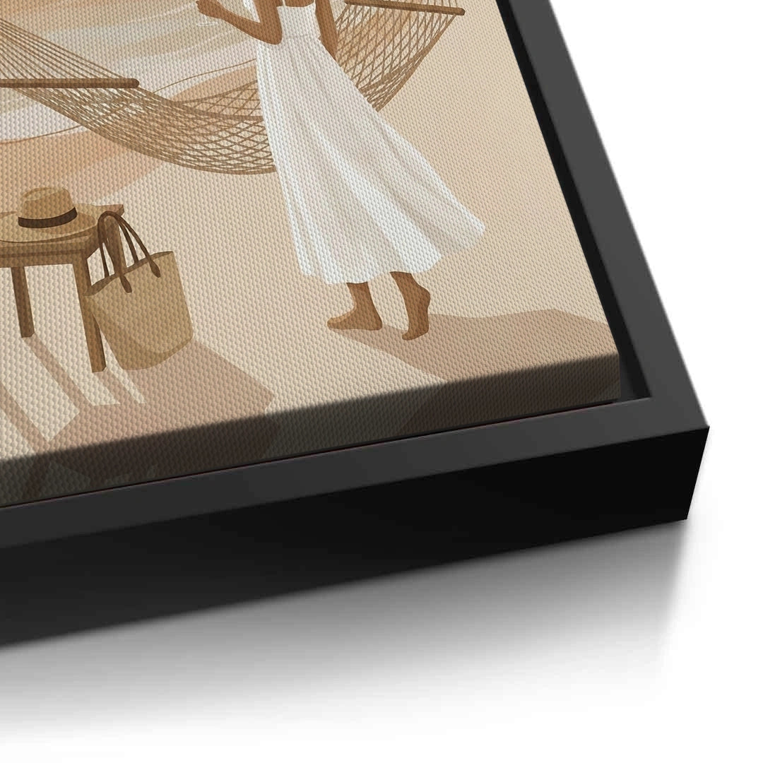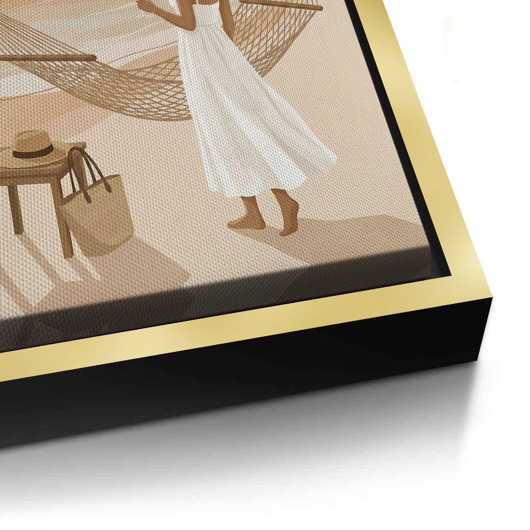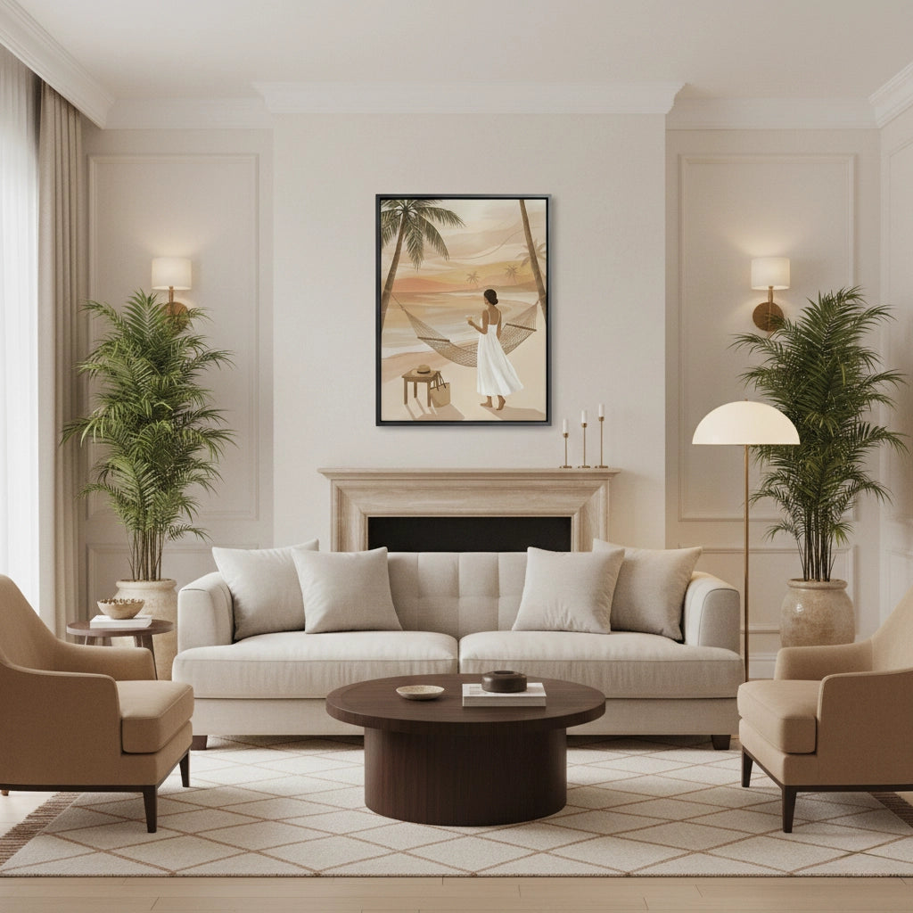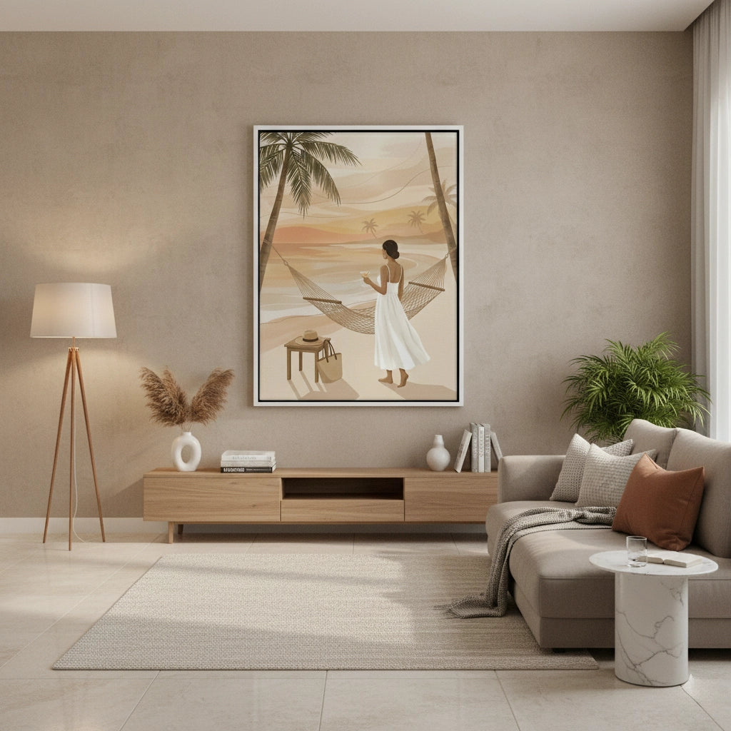Transform your space into a private coastal retreat with the Sunset Beach Hammock from Jasmine Art’s Bohemian series. This serene illustration captures a woman enjoying a golden sunset by the sea, framed by swaying palm trees and a cozy hammock. The warm, sandy color palette brings a sense of calm and luxury to any interior. Finished with our signature premium vertical texture, this print offers a sophisticated tactile finish and high-end gallery depth. A perfect dreamy addition for a master bedroom, a sun-lit lounge, or a luxury villa in Dubai.