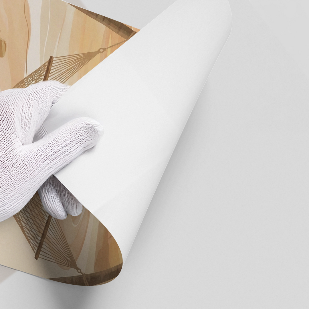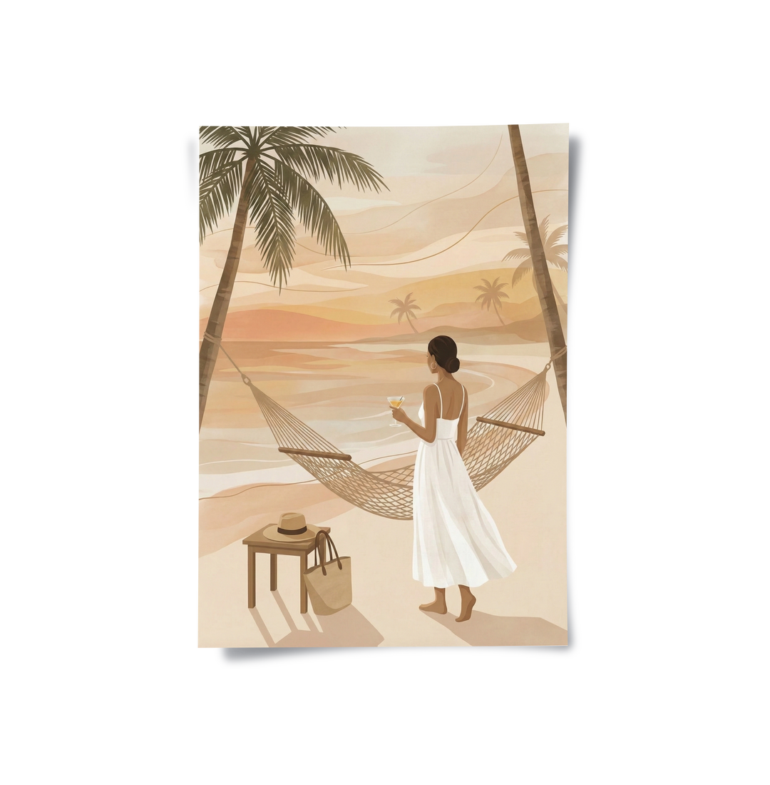 Transform your space into a private coastal retreat with the Sunset Beach Hammock from Jasmine Art’s Bohemian series. This serene illustration captures a woman enjoying a golden sunset by the sea, framed by swaying palm trees and a cozy hammock. The warm, sandy color palette brings a sense of calm and luxury to any interior. Finished with our signature premium vertical texture, this print offers a sophisticated tactile finish and high-end gallery depth. A perfect dreamy addition for a master bedroom, a sun-lit lounge, or a luxury villa in Dubai.