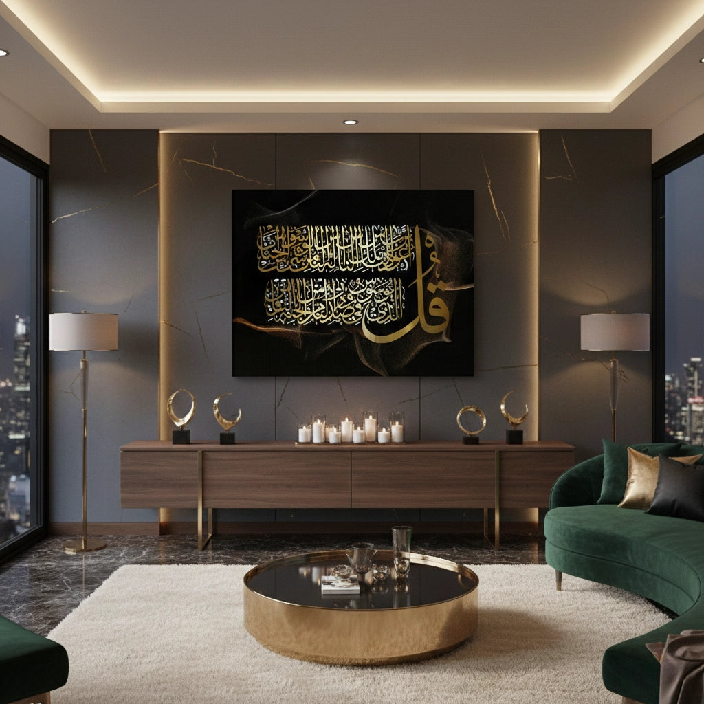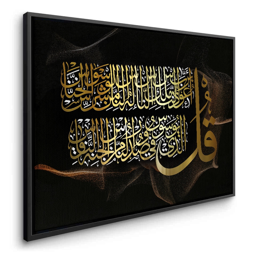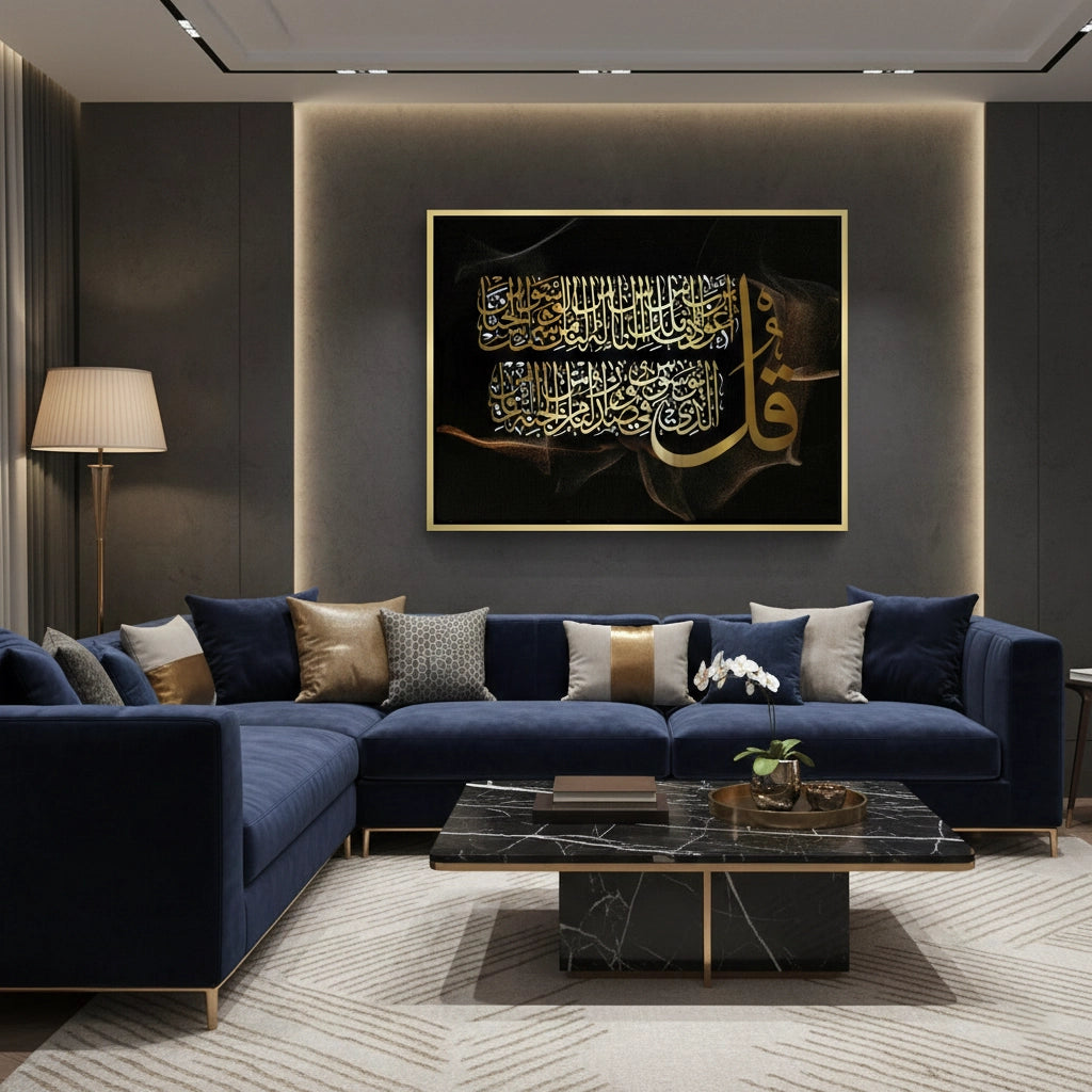 Embrace divine protection with the Surah Al-Nas print from Jasmine Art’s Arabic Calligraphy collection. This masterful artwork renders the final chapter of the Quran in radiant gold Thuluth script, set against a mysterious, smoky black-and-gold background. The bold "Qul" symbol serves as a powerful artistic and spiritual anchor. Finished with our signature premium texture, this print offers exceptional tactile depth and a high-end gallery finish. A perfect spiritual addition to a bedroom, a luxury Majlis, or a family living room in Dubai.