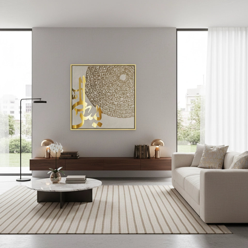 Elevate your spiritual space with the Surah Yasin masterpiece from Jasmine Art’s Arabic Calligraphy collection. This breathtaking artwork features the complete Surah Yasin meticulously arranged in a mesmerizing circular orbital pattern, with the central letters "Ya-Sin" rendered in radiant metallic gold. The warm taupe backdrop adds a layer of timeless elegance, making it a perfect fusion of traditional devotion and modern aesthetics. Finished with our signature premium grain texture, this print provides exceptional tactile depth and a luxury gallery finish. A majestic centerpiece for a spiritual sanctuary, a family Majlis, or a luxury home in Dubai.