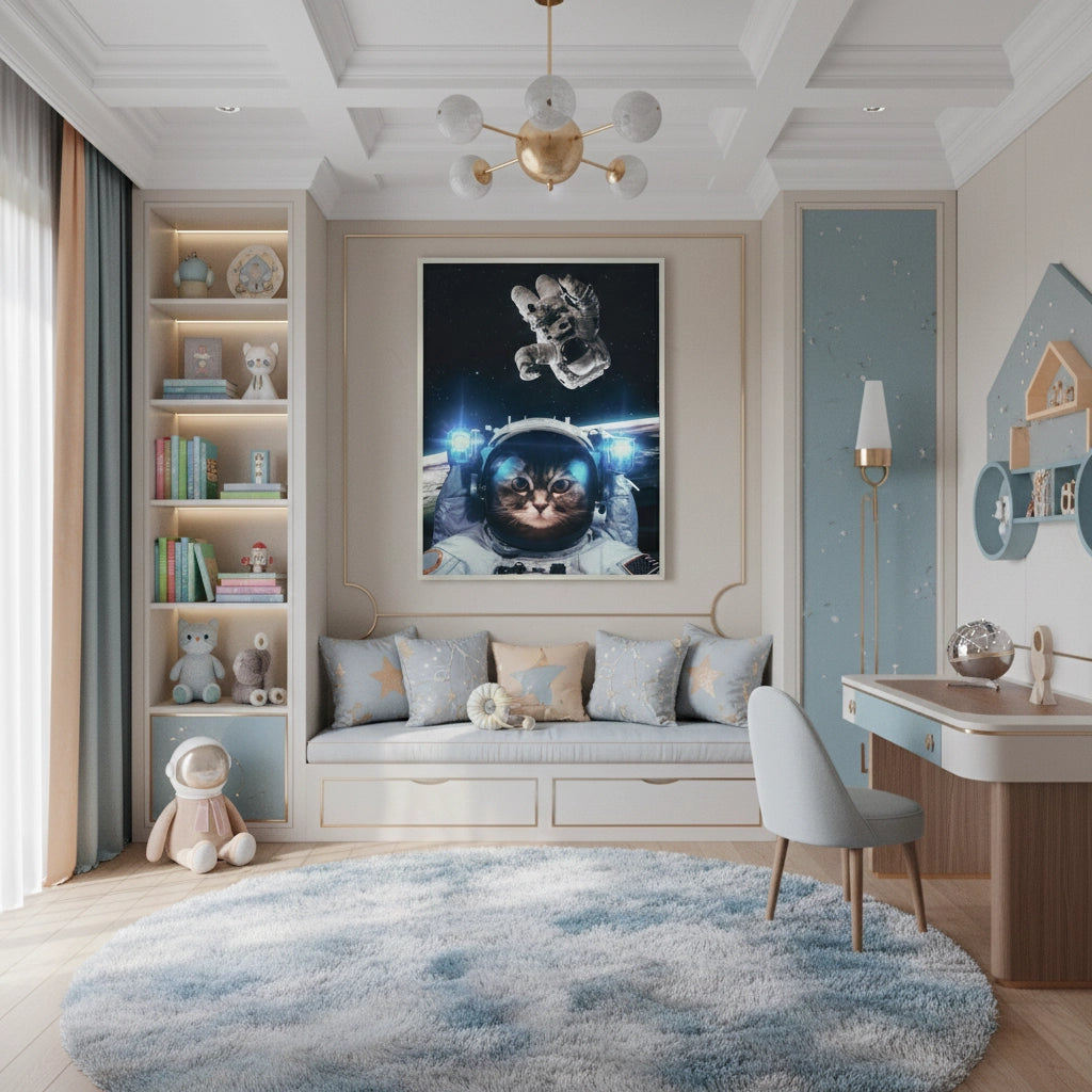 The hilarious and imaginative Surreal Kitty in Space print is a standout piece for any child dreaming of cosmic adventures. This fun digital artwork features an adorable tabby cat astronaut looking intently out of its futuristic helmet, with the deep expanse of space behind it. The bright lights and the floating astronaut hand add a sense of humor and wonder. Perfect for a modern nursery, playroom, or older child’s room, this print adds a quirky, futuristic, and memorable statement to your home in Dubai.