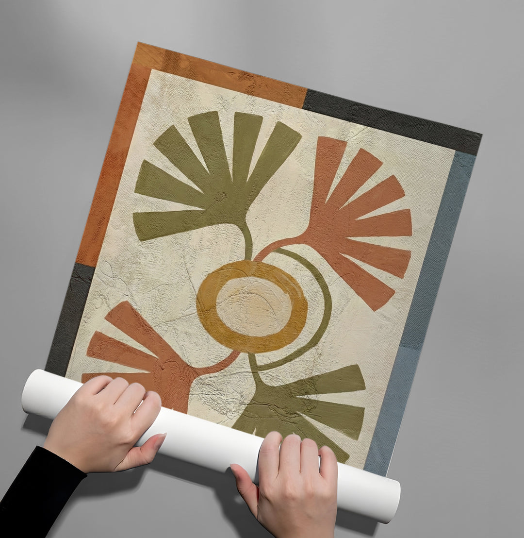 Bring a sense of balance and natural order to your home with Symmetrical Botanical Radiance from Jasmine Art’s Bohemian series. This sophisticated abstract features fan-shaped organic forms in a harmonious symmetrical layout, rendered in a grounded palette of olive green, terracotta, and mustard. Its geometric precision and earthy tones create a calm, structured atmosphere for any modern interior. Finished with our signature premium vertical texture, this print offers exceptional tactile depth and a high-end gallery finish. A perfect grounding accent for a modern study, a balanced living room, or a stylish hallway in Dubai.
