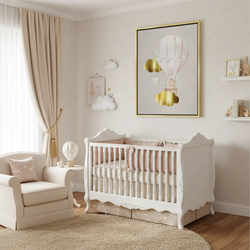 Embrace classic charm and nostalgia with the Teddy Bear Hot Air Balloon print. Its comforting textures and timeless theme make it an essential, treasured piece for any traditional or classic nursery in Dubai.
