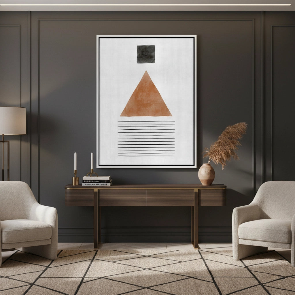Redefine your walls with Geometric Totem from Jasmine Art’s Bohemian collection. This minimalist masterpiece features a balanced vertical composition of a charcoal square, a textured terracotta triangle, and precise linear patterns. The earthy palette and clean architectural lines bring a sense of order and modern warmth to contemporary spaces. Finished with our signature premium vertical-ribbed texture, this print offers exceptional tactile depth and a high-end gallery finish. A sophisticated centerpiece for a luxury apartment, a modern executive office, or a chic studio in Dubai.