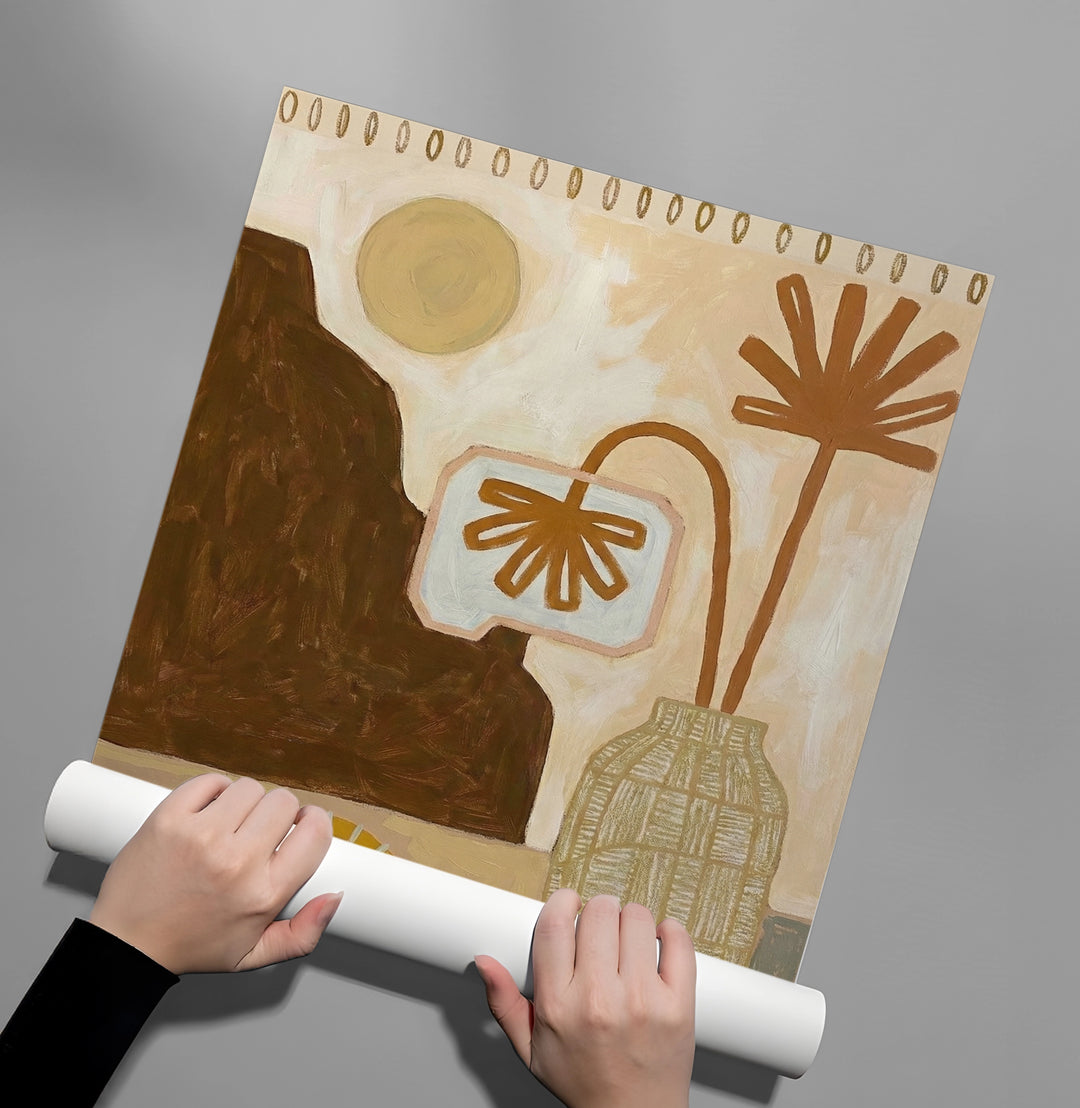 Embrace spiritual elegance with the Terracotta Sunset from Jasmine Art’s Bohemian series. This captivating artwork features a textured vase with abstract blooms, set against a rugged mountain landscape and a protective sun-burst eye symbol. The warm palette of rust, mustard, and earthy brown adds a soulful, grounded energy to any modern room. Finished with our signature premium vertical texture, this print offers exceptional tactile depth and a luxury gallery finish. An ideal statement piece for a cozy living room, a spiritual corner, or a creative studio in Dubai.