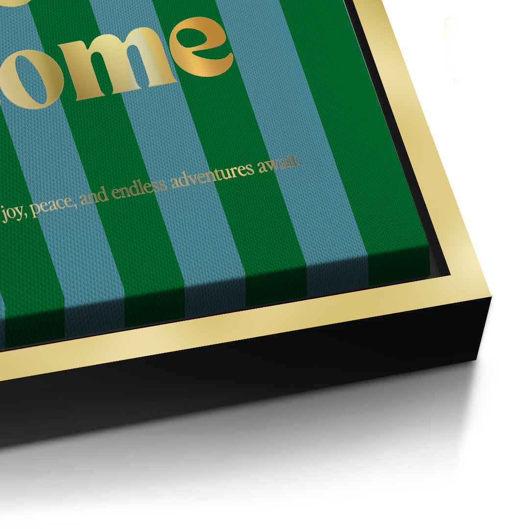 The vibrant The Best Is Yet To Come - Bold Stripes & Gold Typography print is a powerful, optimistic statement piece. The central affirmation "The best is yet to come" is rendered in bold, luxurious metallic gold Serif typography. This striking gold text is dramatically set against a high-contrast background of deep green and muted blue vertical stripes. The secondary quote reminds us that "joy, peace, and endless adventures await". This piece is perfect for injecting bold colour, sophisticated motivation, and luxurious energy into a modern living room, hallway, or office in Dubai.