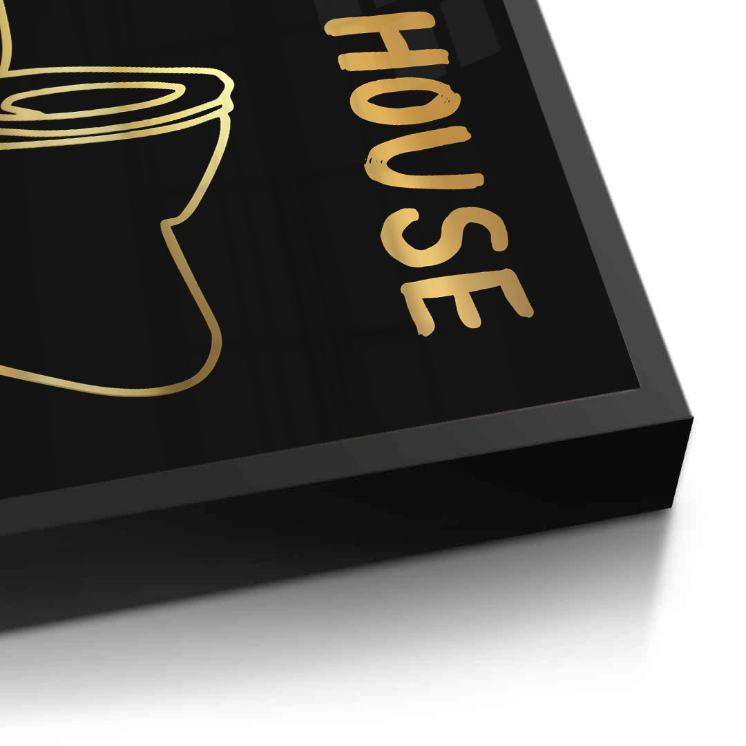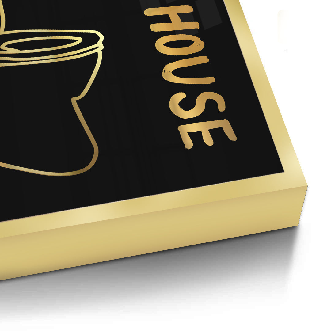The witty Best Seat in the House - Gold Bathroom Humour print adds a touch of playful luxury to the most essential room. The iconic phrase "THE BEST SEAT in the HOUSE" is presented in bold, hand-painted style metallic gold typography alongside a matching gold outline graphic of a toilet. The humorous gold graphic and text are dramatically set against a deep black, textured pinstripe canvas, ensuring a high-contrast and opulent finish. This piece is the perfect bold, fun statement for a modern bathroom or powder room in Dubai.