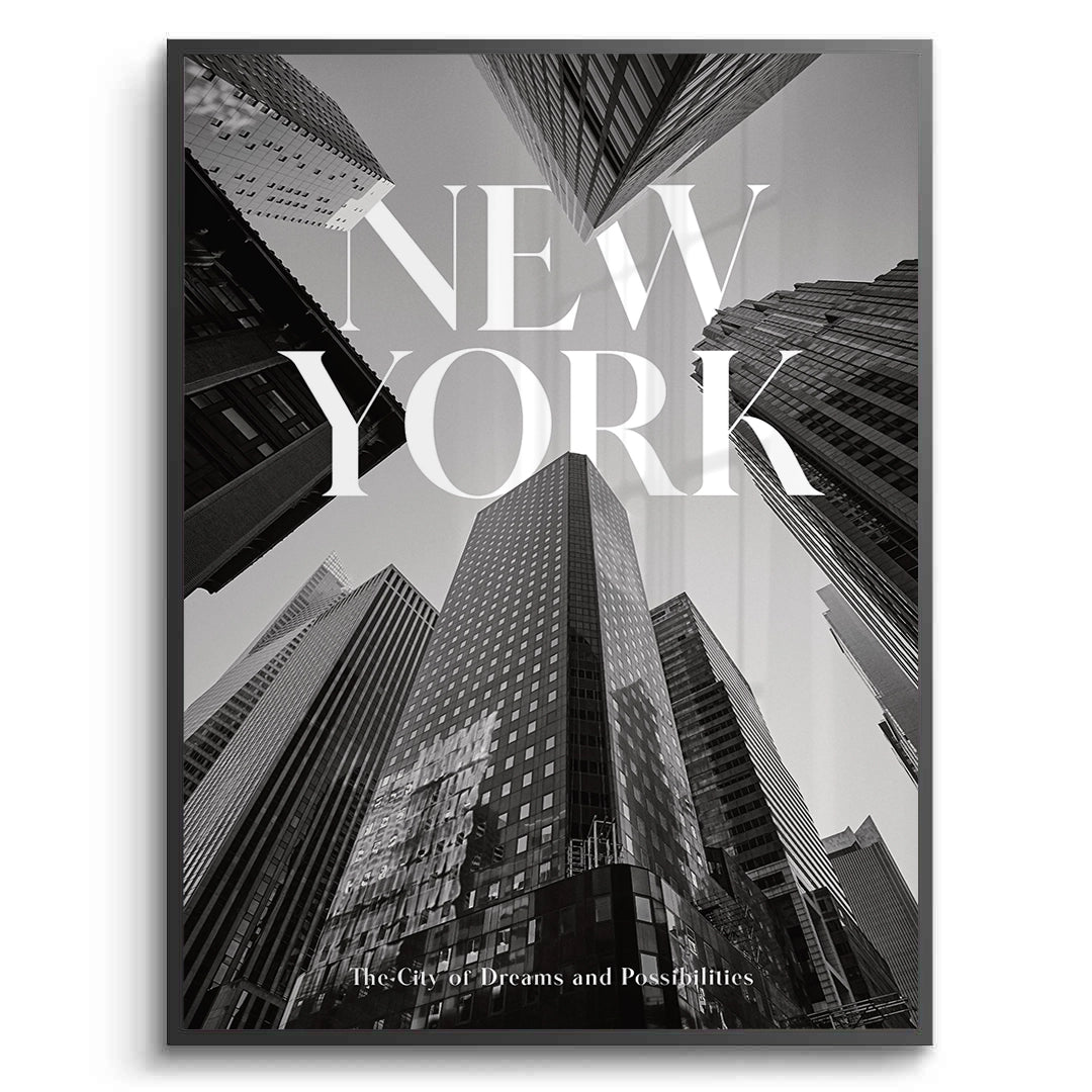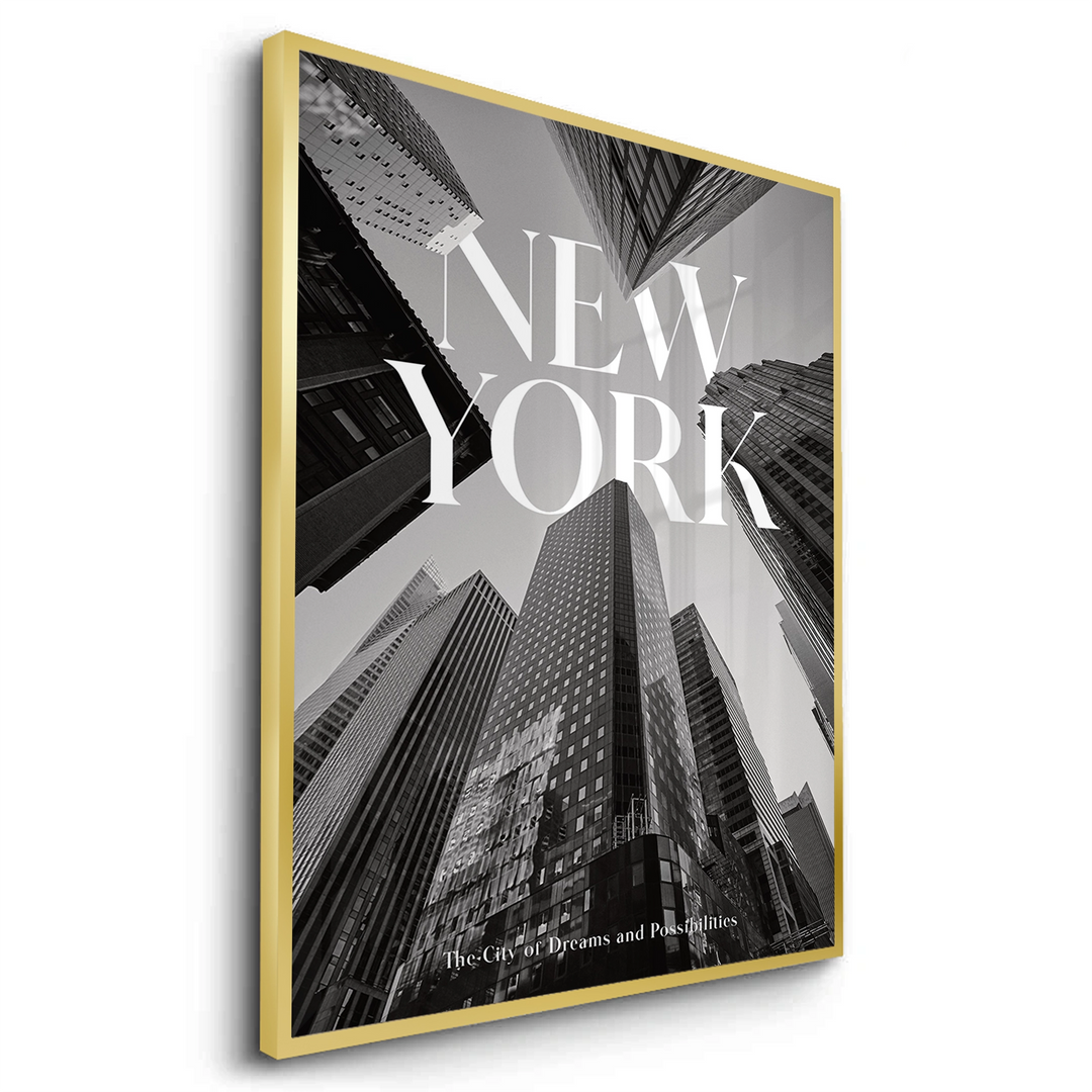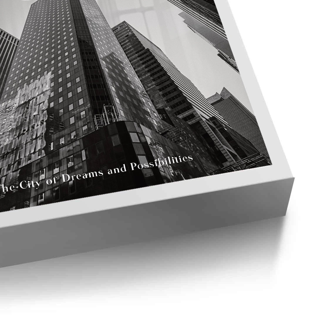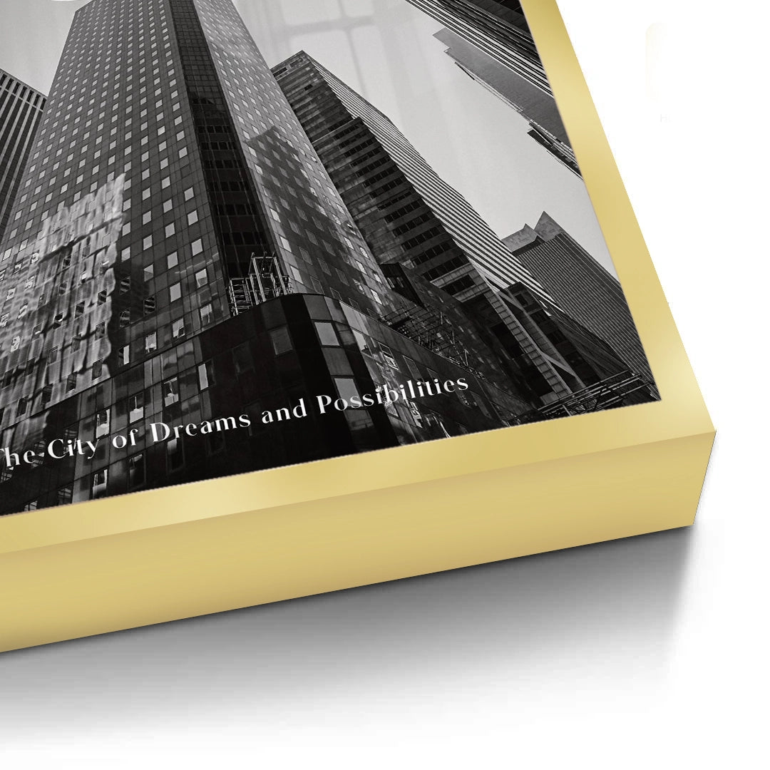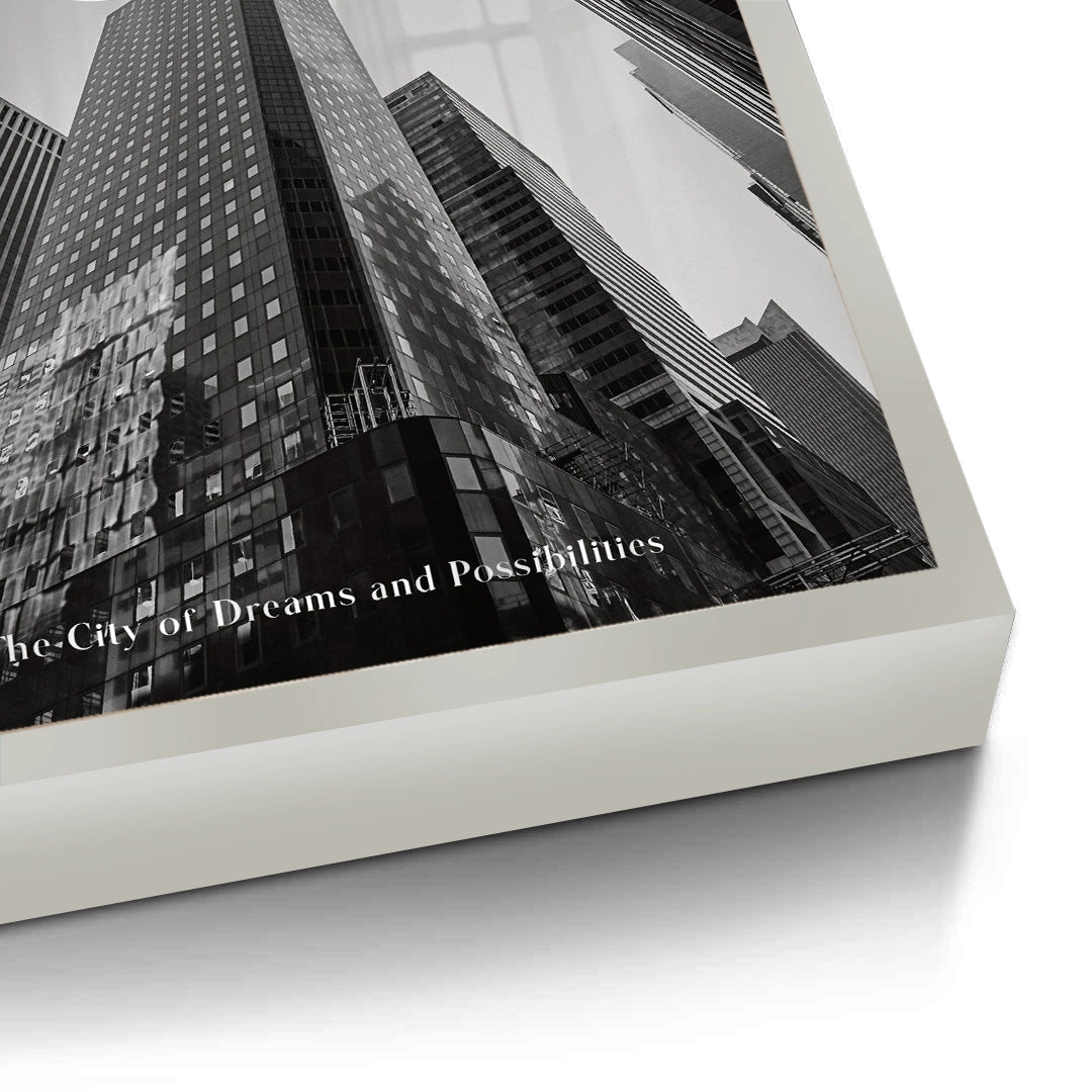 Celebrate the boundless energy of the big city with The City of Dreams art print. This bold monochrome poster features a dramatic upward view of New York City’s iconic skyscrapers, capturing the essence of ambition and modern architectural marvels. The striking black and white photography, paired with elegant typography, creates a sophisticated urban aesthetic. Finished with our signature premium vertical texture, this print offers a high-end tactile depth that enhances its sleek design. It is an ideal statement piece for a modern office, a contemporary living room, or a stylish loft in Dubai.